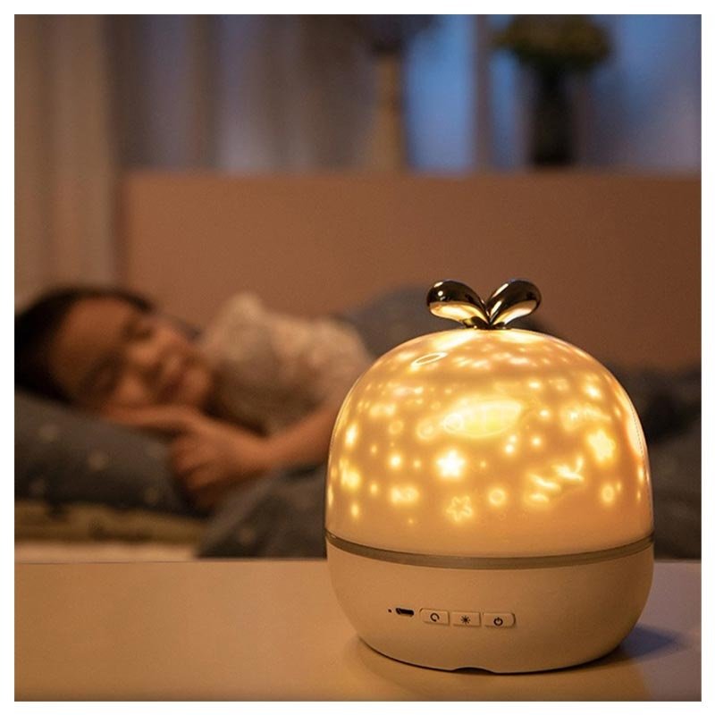 Ta med deg stjernehimmelen inn på babyens rom med LED-projektoren roterende stjernelys. Projektoren har 6 forskjellige temaer, inkludert stjerner, hav og mer. Med sin 360-graders rotasjon skaper du en vakker og beroligende atmosfære i alle rom.