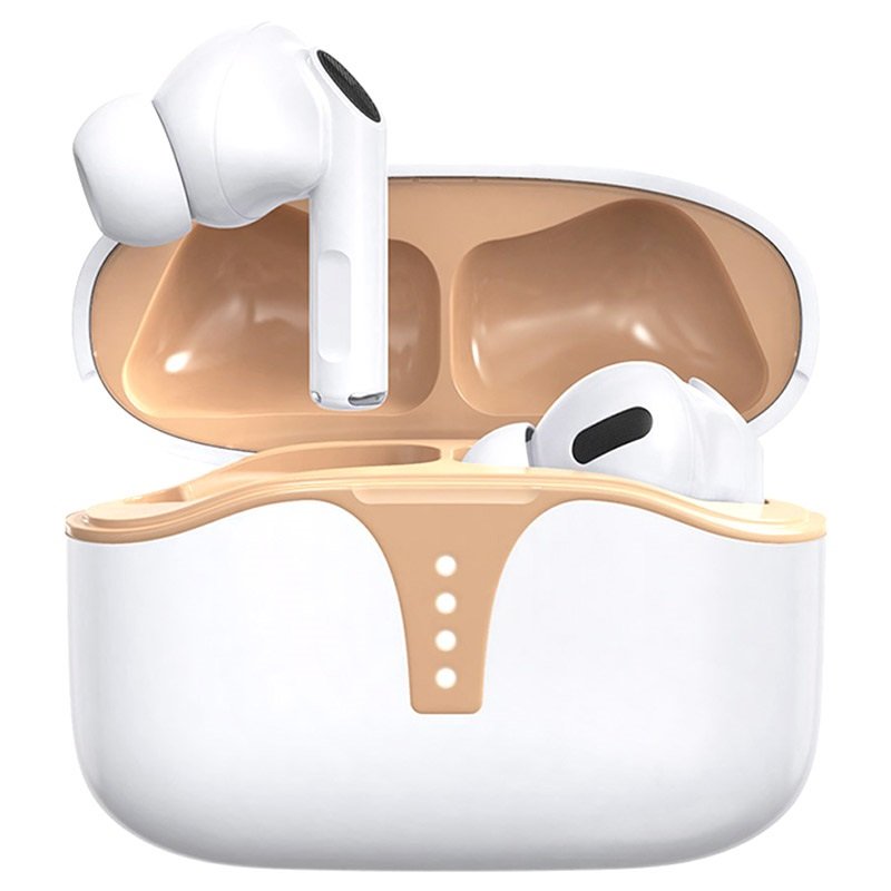M20 TWS hodetelefoner er et annet flott par budsjettvennlige trådløse øretelefoner som du kan vurdere. Disse øretelefonene kommer i hvitt med et snev av ørkenrosa på ladeboksen, noe som gjør dem til et søtt og stilig tilbehør.