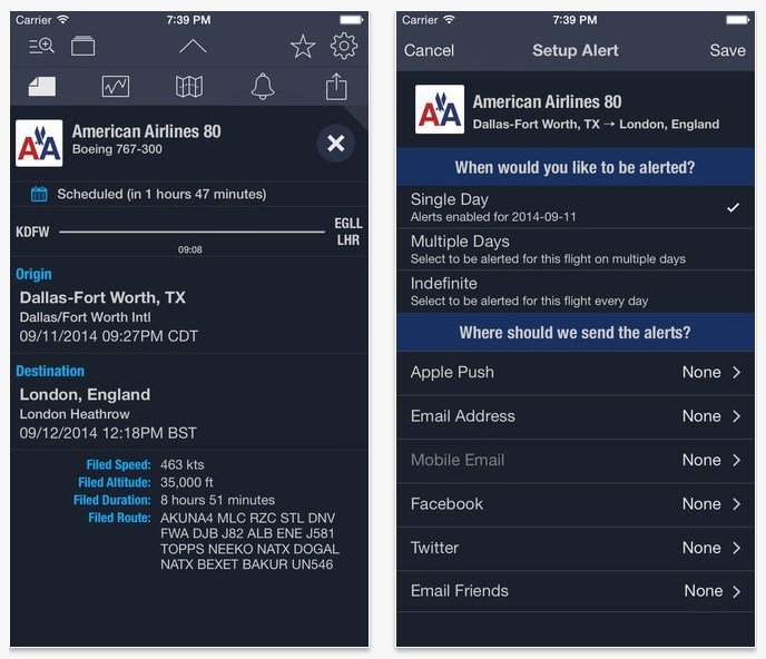 Dersom flyet blir kansellert, forsinket eller om det for eksempel får avgang fra en ny gate, får du straks vite dette på FlightAware. Følg real-time-statusen til hvilken som helst kommersiell flyvning verden over, og ha alle detaljer for hånden.