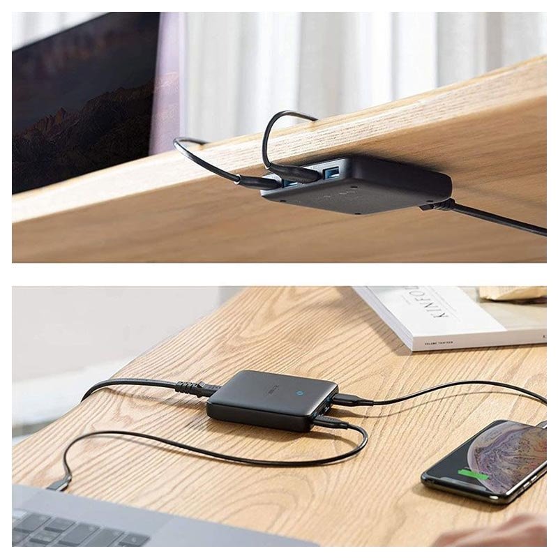Det slanke designet gjør at den enkelt kan installeres under skrivebordet for å skape et rent utseende. Den leveres med 4 porter og støtter også hurtiglading for kompatible Apple-enheter.