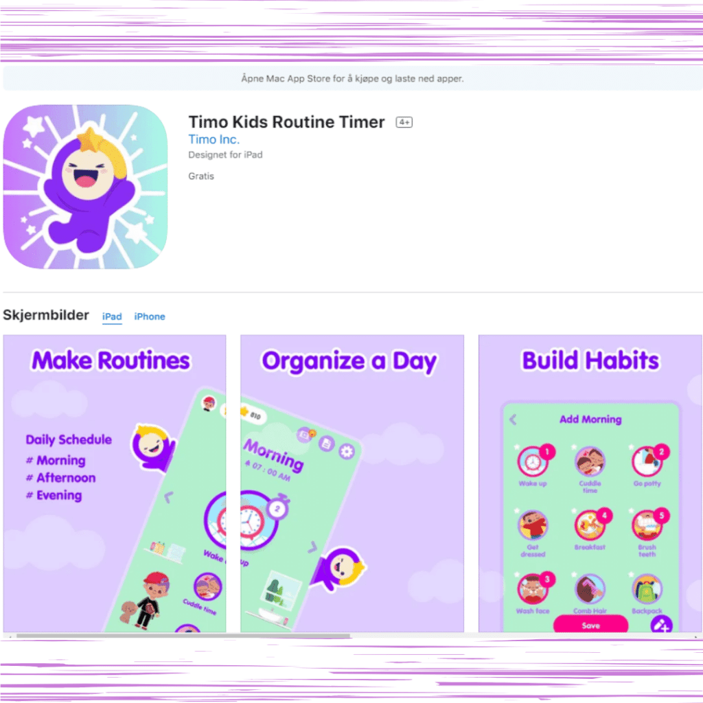 Små barn kan ha det vanskelig å følge en tidsplan og er kanskje ikke i humør til å fullføre oppgavene for den dagen. Men med Timos søte brukergrensesnitt og sjarmerende karakterer, kan du få de små til å glede seg over og lære seg tidsstyring.