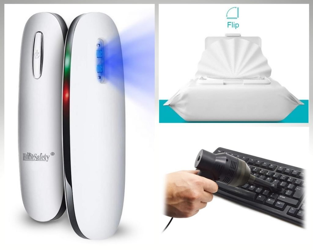 Med en bærbar USB-støvsuger kan du enkelt fjerne støv fra skrivebordet og tastaturet mens en UV steriliseringslampe kan brukes til å fjerne opptil 99,9% av bakteriene som legger seg på alt fra mus og nettbrett til hodetelefonene dine. Med en hygienisk desinfeksjonsserviett med alkohol kan du lett bli kvitt uønskede bakterier overalt i hjemmet.