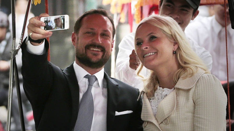 I mars besøkte kronprins Håkon og kronprinsesse Mette-Marit Thailand, og på bildet tar de selfier av seg i en sykkeltaxi, i Hanoi.