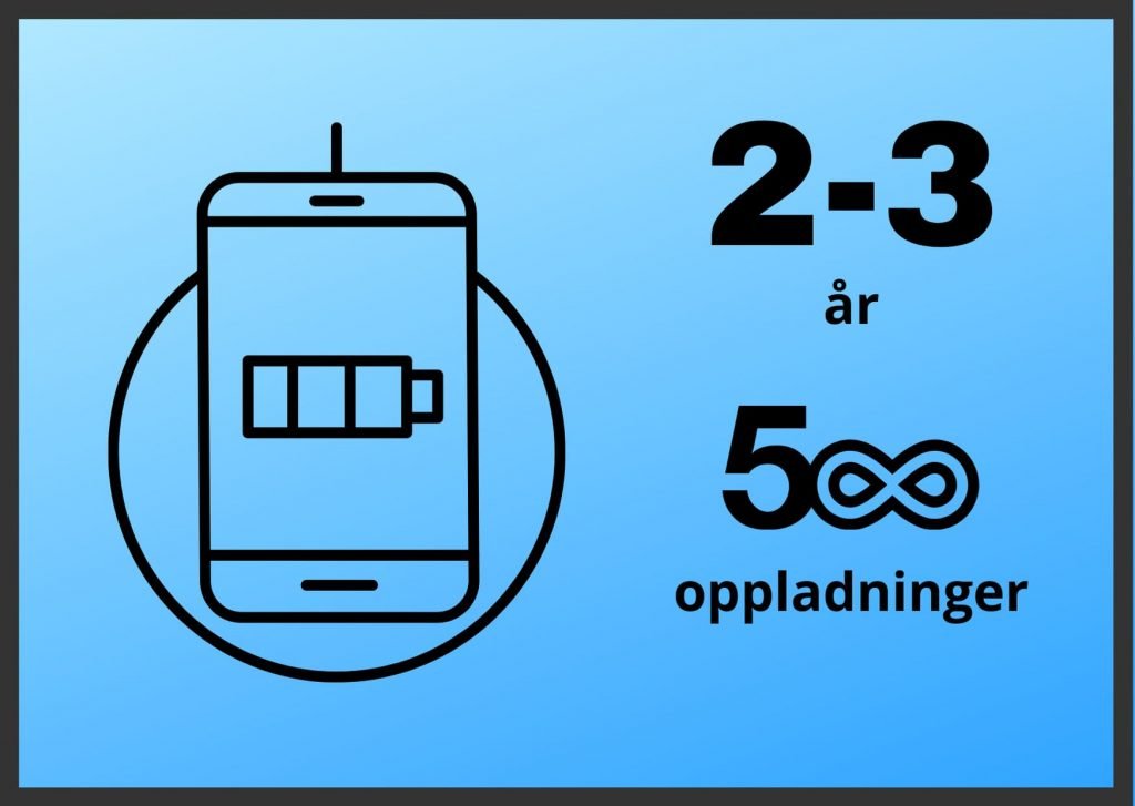 I gjennomsnitt skal de fleste smarttelefonbatterier vare i to til tre år. Den skal kunne levere minst 500 komplette ladinger. Imidlertid vil denne estimeringen variere avhengig av mobiltelefonbruk.