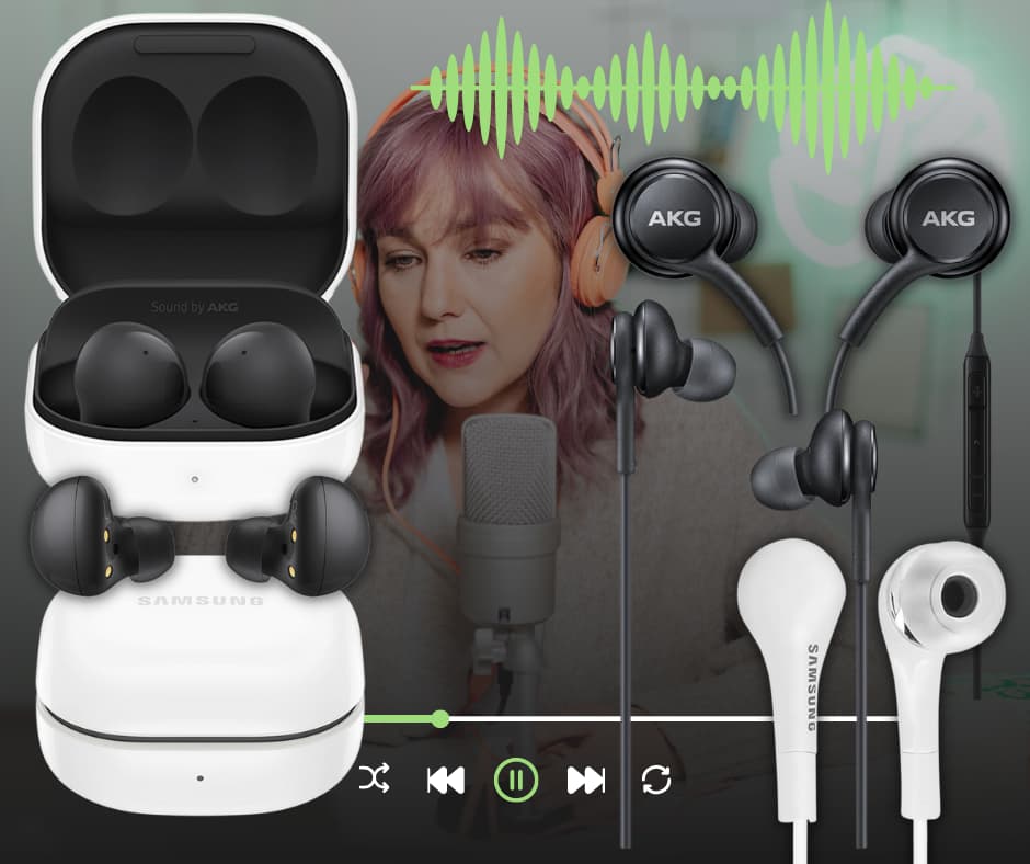 Samsungs originale øretelefoner, som Samsung USB Type-C øretelefoner EO-IC100 og Samsung EHS64AVFWE stereo headset, fortsetter å være et populært valg. For mange er de et favorisert valg fordi de ikke så lett kan forsvinne eller gå tapt, i motsetning til trådløse øretelefoner.