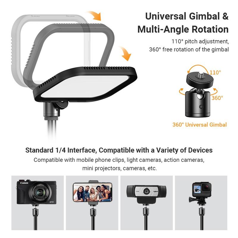 - Fleksibel posisjonering: LED-panelet kan justeres 110° og roteres 360° via kardangrepet, noe som gir mulighet for presis lysretning.