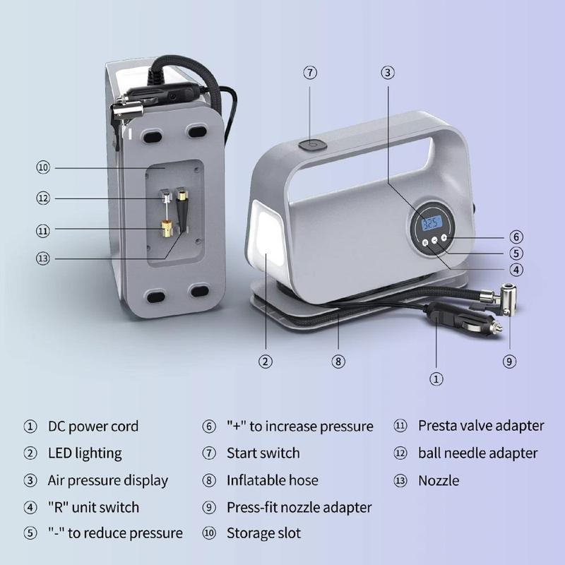 - Multifunksjonell oppblåsing - leveres med flere adaptere for enkel oppblåsing av bildekk, sykkeldekk, motorsykler, sportsballer og oppblåsbart utstyr.