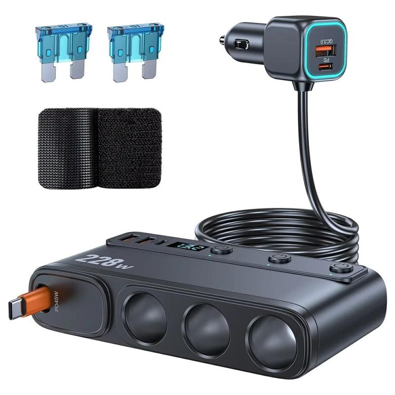 228 W 9-i-1 billader med hurtigladende sigarettennerdeler med uavhengige brytere og LED-skjerm - 3 x QC3.0 USB-A, 2 x PD USB-C, PD USB-C-kabel, 3 x sigarettenneruttak