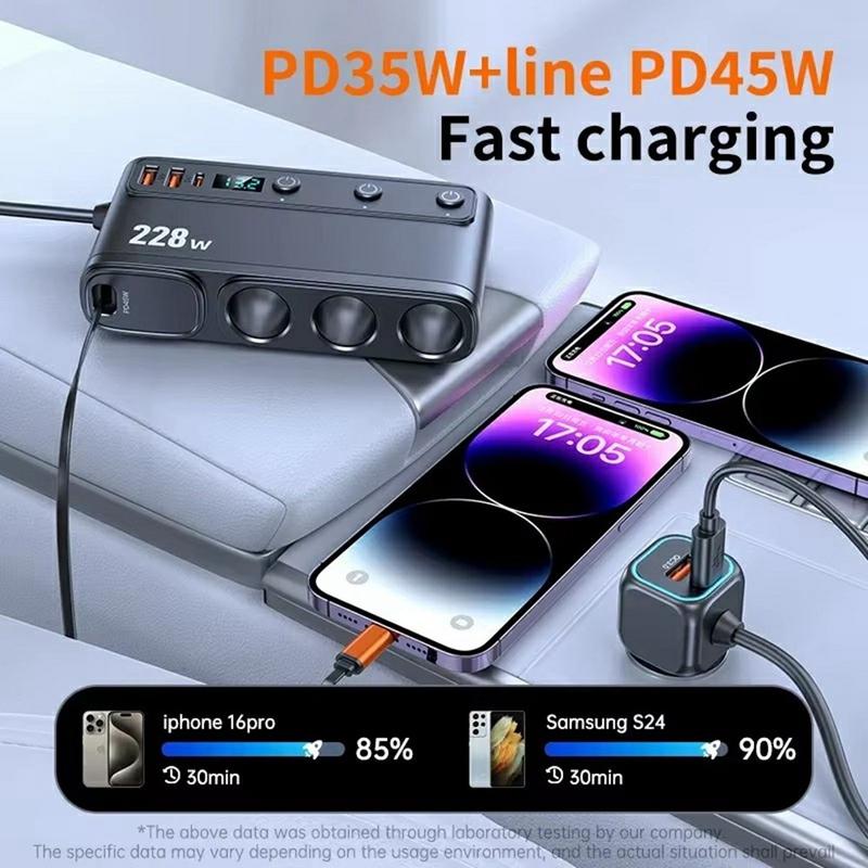I stedet for å sjonglere med flere ladere eller gå tom for stikkontakter, gir 228 W 9-i-1-billaderen deg en alt-i-ett-strømløsning. Den kombinerer hastighet, kontroll og sikkerhet - og hjelper deg med å holde deg tilkoblet og oppladet uansett hvor reisen tar deg.