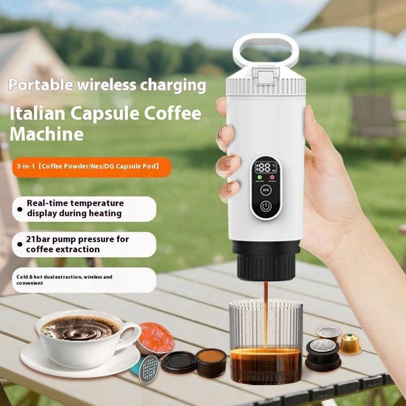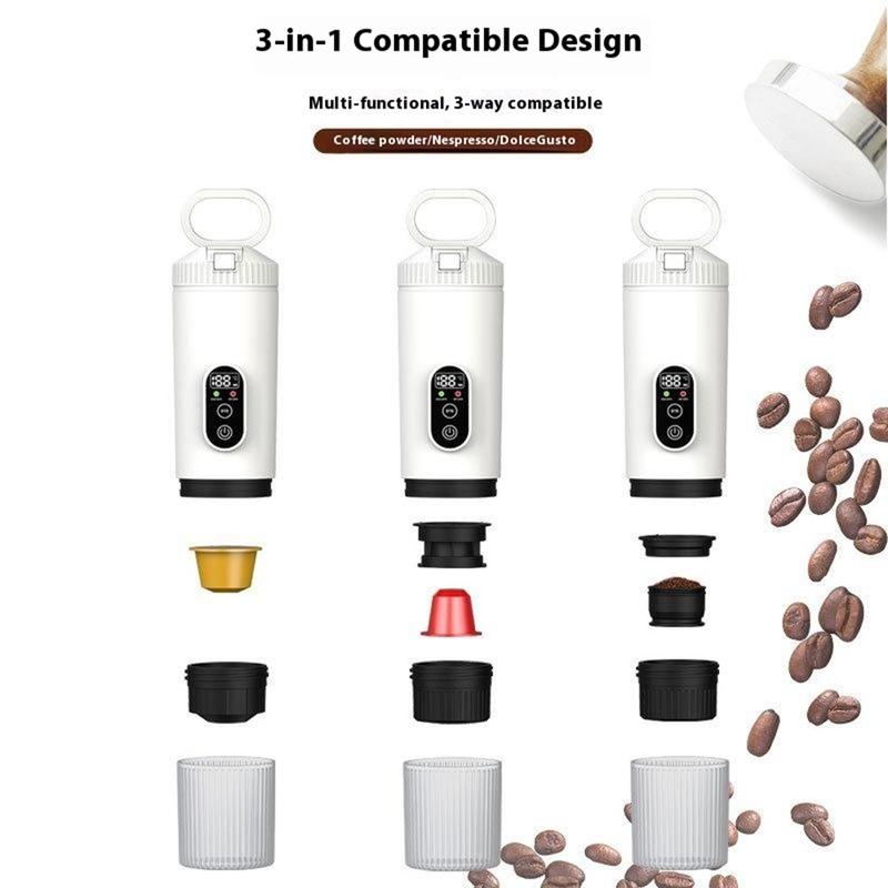 3-i-1 bærbar espressomaskin - trådløs elektrisk kapselkaffemaskin med 7500 mAh batteri for bil, hjemme og utendørs - kompatibel med Nespresso, DolceGusto-kapsler, kaffepulver