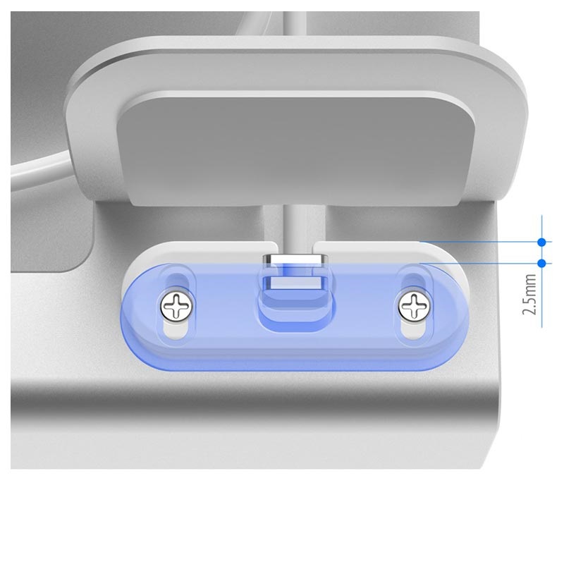 Under lading holdes alle enhetene dine i en perfekt synsvinkel. En justerbar struktur på ladestativet for iPhone og AirPods tillater lading av dine gadgets med beskyttende skall. Den maksimale tykkelsen på iPhone skalet kan være 2,5 mm.