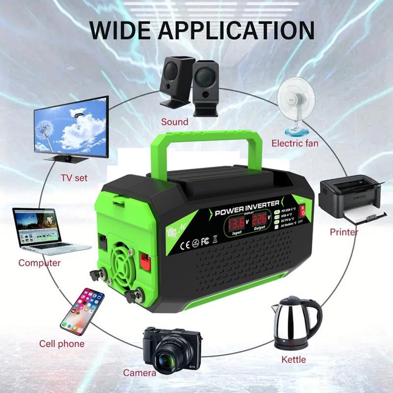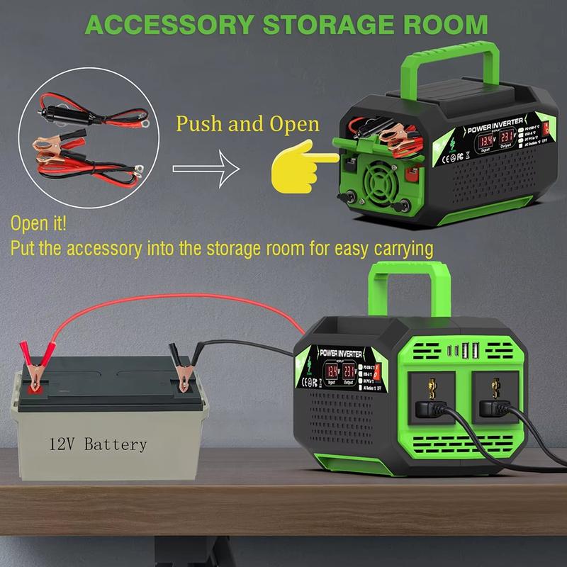 - Effektiv DC til AC-konvertering - Konverterer 12 V likestrøm til 220 V vekselstrøm med en kontinuerlig utgangseffekt på 300W og en toppeffekt på opptil 600 W, ideelt for bærbare datamaskiner, nettbrett, CPAP-maskiner, kameraer og andre bærbare enheter.