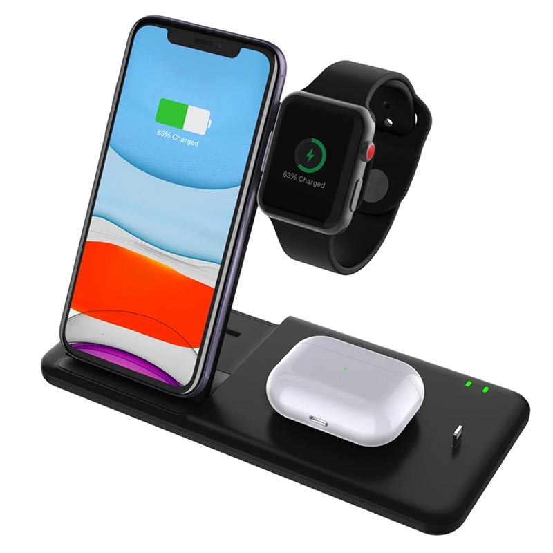 Denne utrolige trådløse ladestasjonen Q20 kan lade hele fire enheter samtidig! Takket være den sammenleggbare designen kan du ta den med deg på tur, og for å lade to telefoner, øretelefoner og smartklokker sammen må du bruke en 9V/3A ladeadapter (IKKE inkludert).