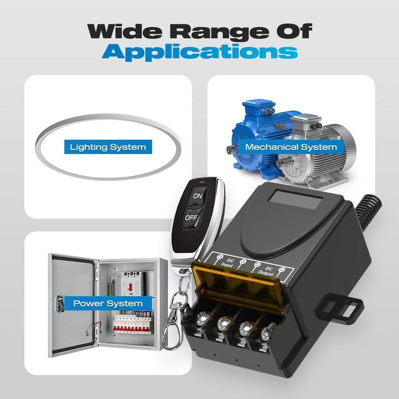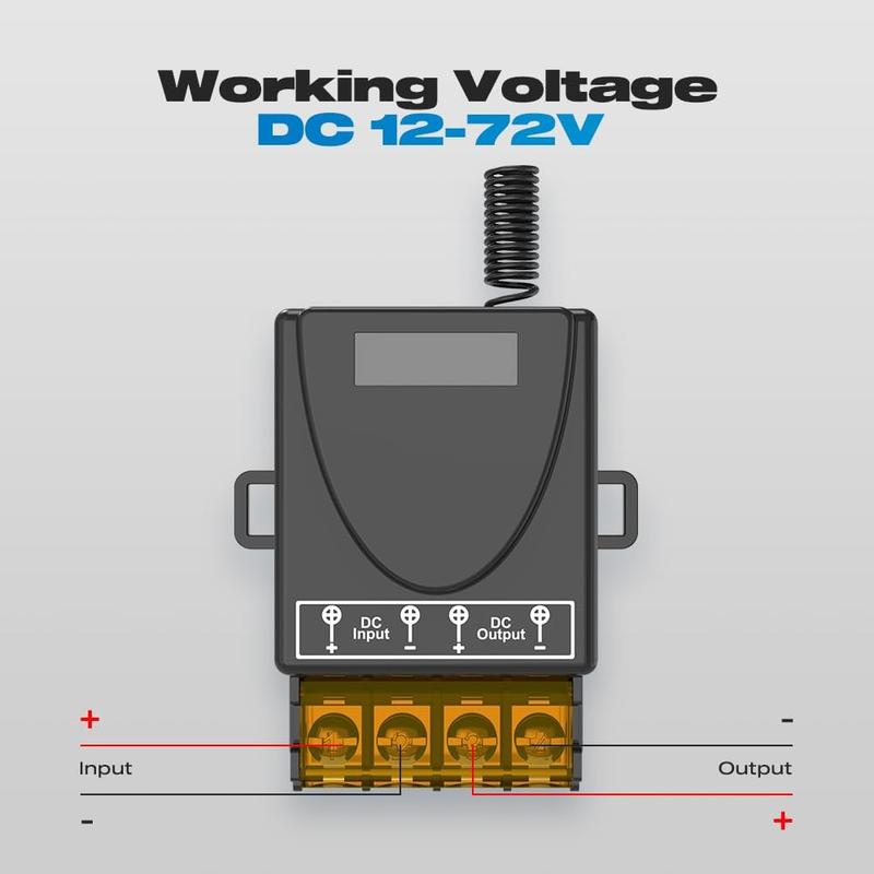 Styr dine DC-drevne enheter trådløst med dette 433MHz RF-relébryter-settet, som er designet for praktisk fjernstyrt på/av-betjening i en rekke bruksområder. Det er egnet for 12 V-72 V-systemer og kan brukes med LED-belysning, vifter, motorer, pumper og utvalgte sikkerhets- eller automatiseringsoppsett. Den medfølgende mottakeren og to fjernkontroller gir deg fleksibel betjening for hjemmeprosjekter, verksteder, garasjer, porter og utstyrskontroll.