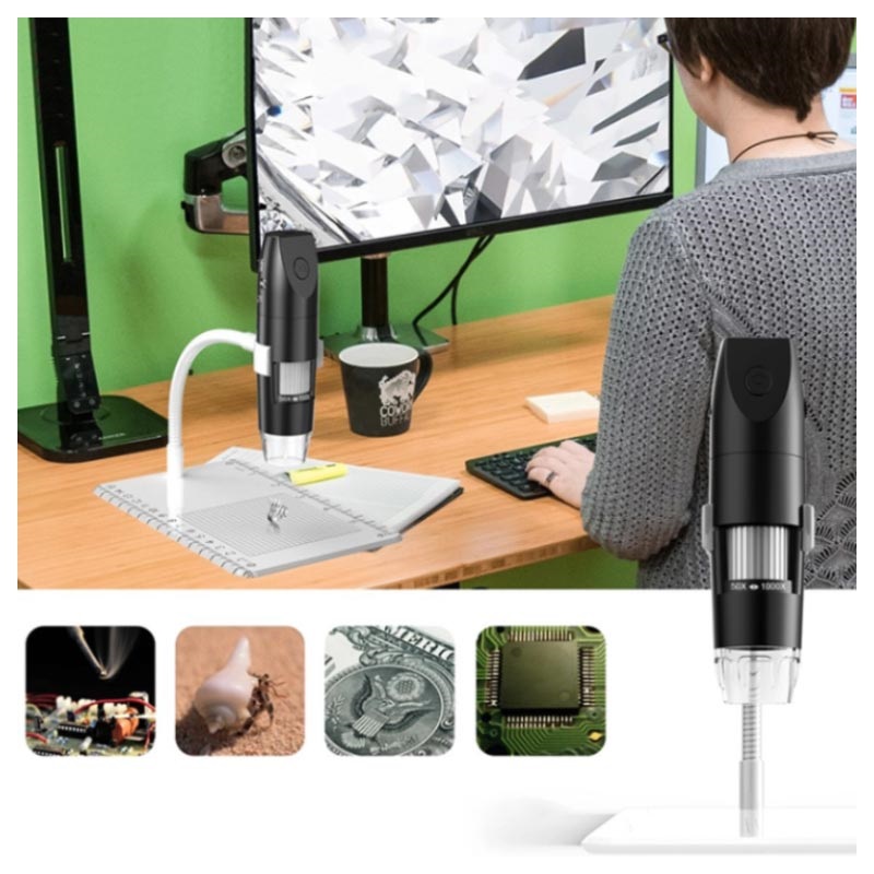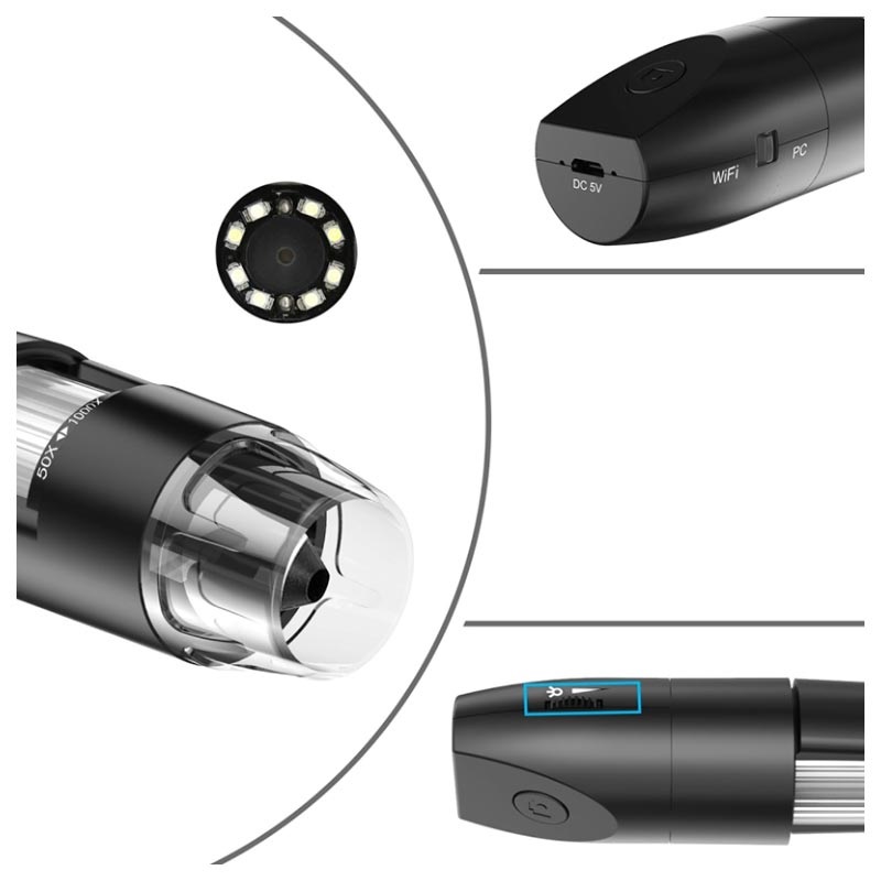 8 justerbare LED-er gir optimal klarhet, mens 2MP-kamera gir deg detaljert observasjon av 3D-gjenstander som innsikt, mynter, smykker og lar deg glede deg over hver detalj takket være en forstørrelseszoom på 50x til 1000x. Koble dette digitale mikroskopet med WiFi med din Android- eller iOS-enhet eller med Windows- eller Max-datamaskin. Når WiFi-tilkobling ikke er tilgjengelig, kan du bruke microUSB-kabel for å sammenkoble denne modulen med USB-støttede enheter.