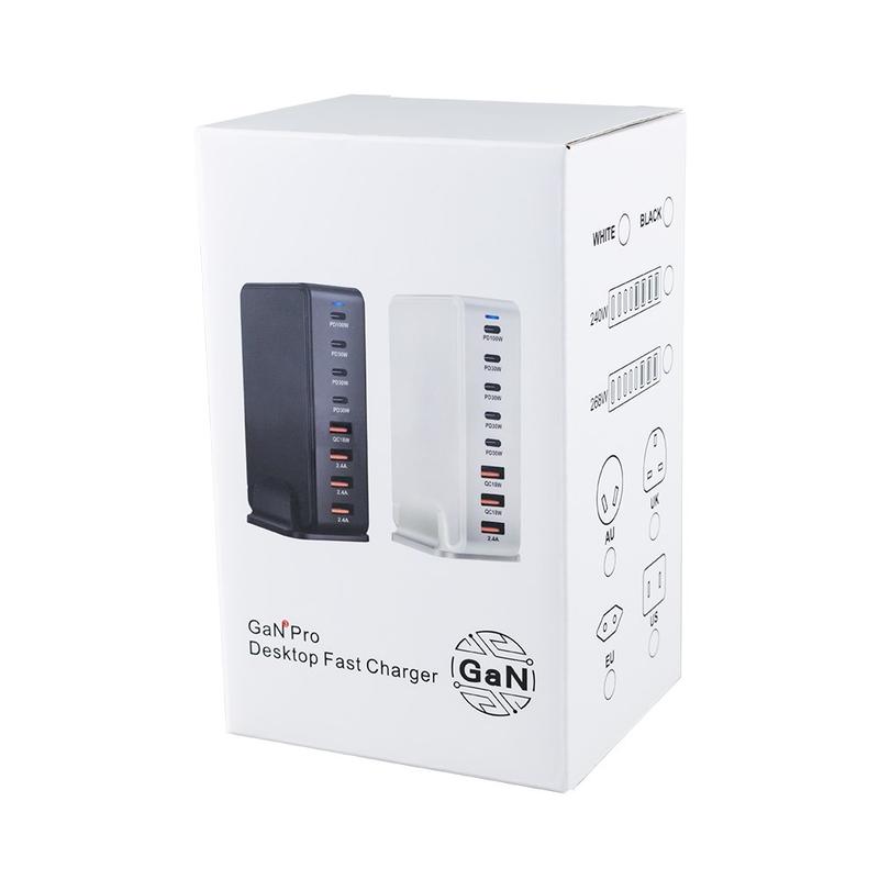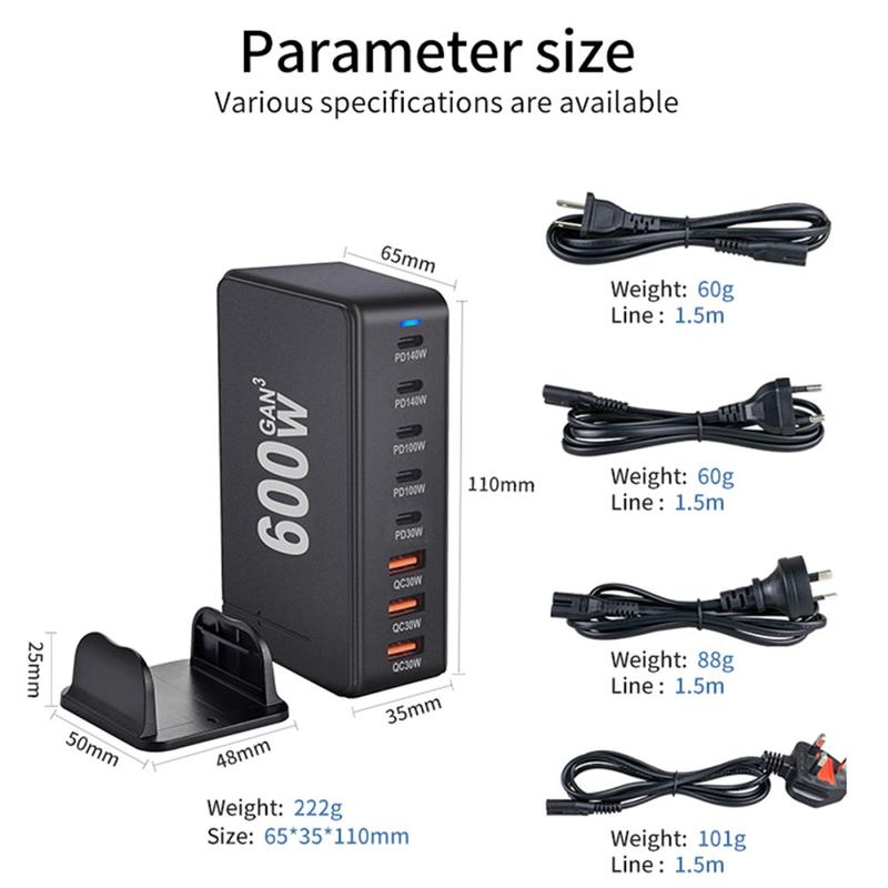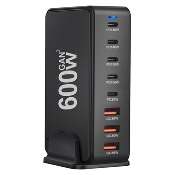 600W GaN-stasjon for stasjonær lading - 8 porter (5x USB-C + 3x USB-A) PD3.1 hurtiglader, opptil 140 W USB-C, intelligent strømfordeling