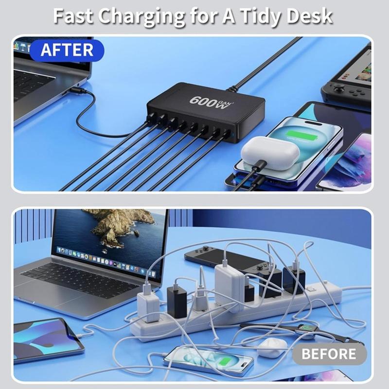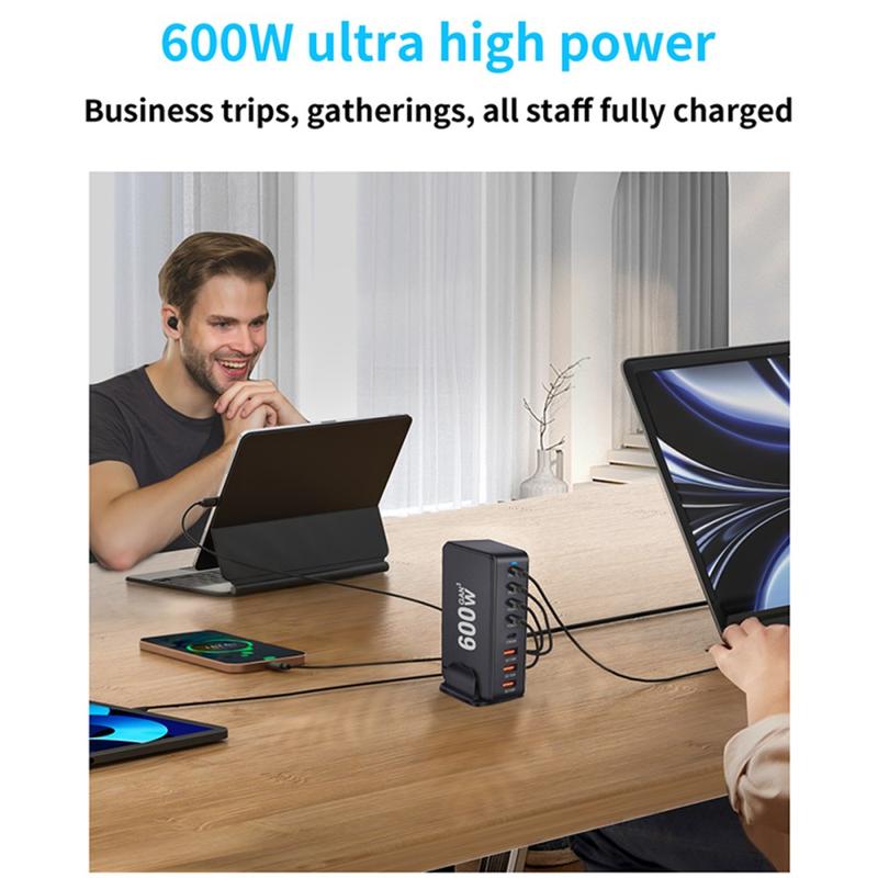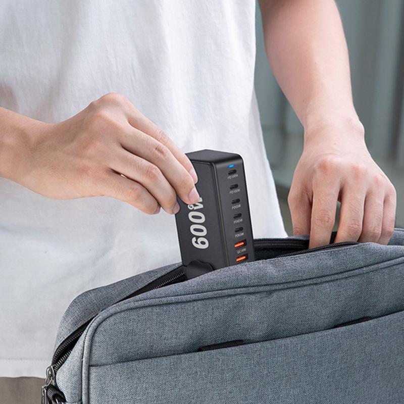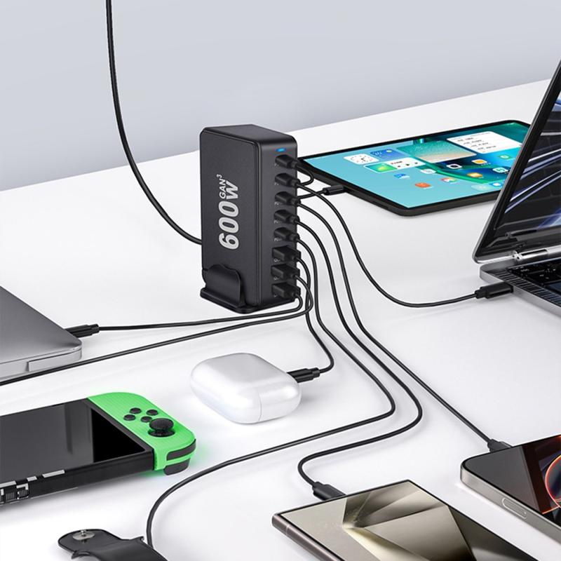 Strømforsyner hele oppsettet ditt fra én kompakt hub. Denne 600W GaN-ladestasjonen er laget for travle skrivebord, delte husholdninger og teknologitunge reisesett, slik at du kan lade opptil 8 enheter samtidig. Med 5 USB-C-porter og 3 USB-A-porter er den klar for alt fra kraftige USB-C-bærbare datamaskiner til telefoner, nettbrett, ørepropper og powerbanks. Støtte for PD3.1 og QC3.0 sikrer rask lading på kompatible enheter, mens intelligent strømfordeling automatisk tilpasser utgangseffekten avhengig av hva som er tilkoblet. Sikkerhetsbeskyttelse i flere lag sørger for stabil og bekymringsfri lading, selv når flere enheter er koblet til.