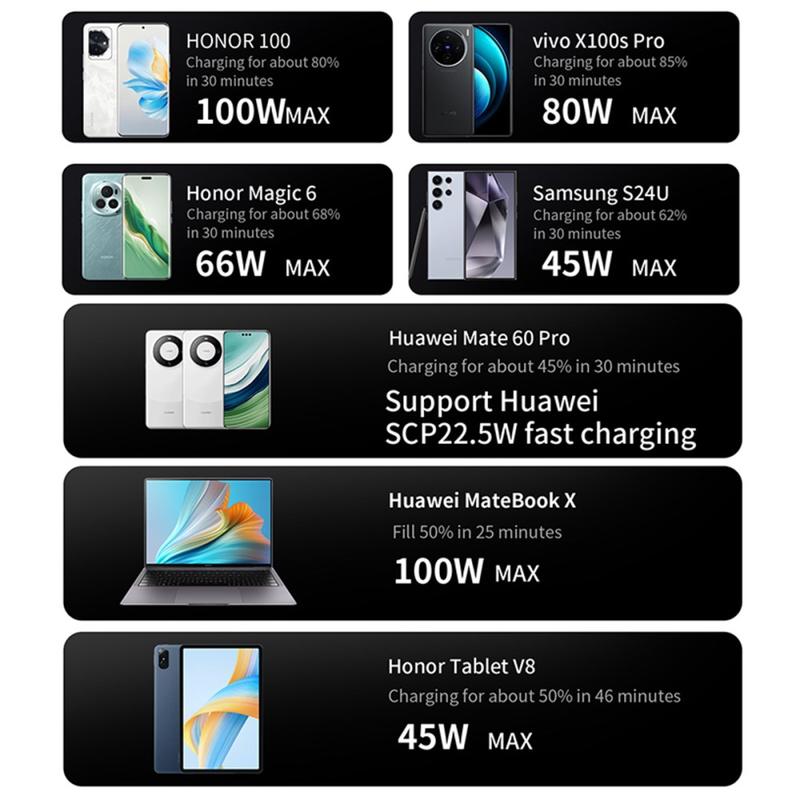 - Støtte for hurtiglading: PD3.1, QC3.0 og andre vanlige standarder