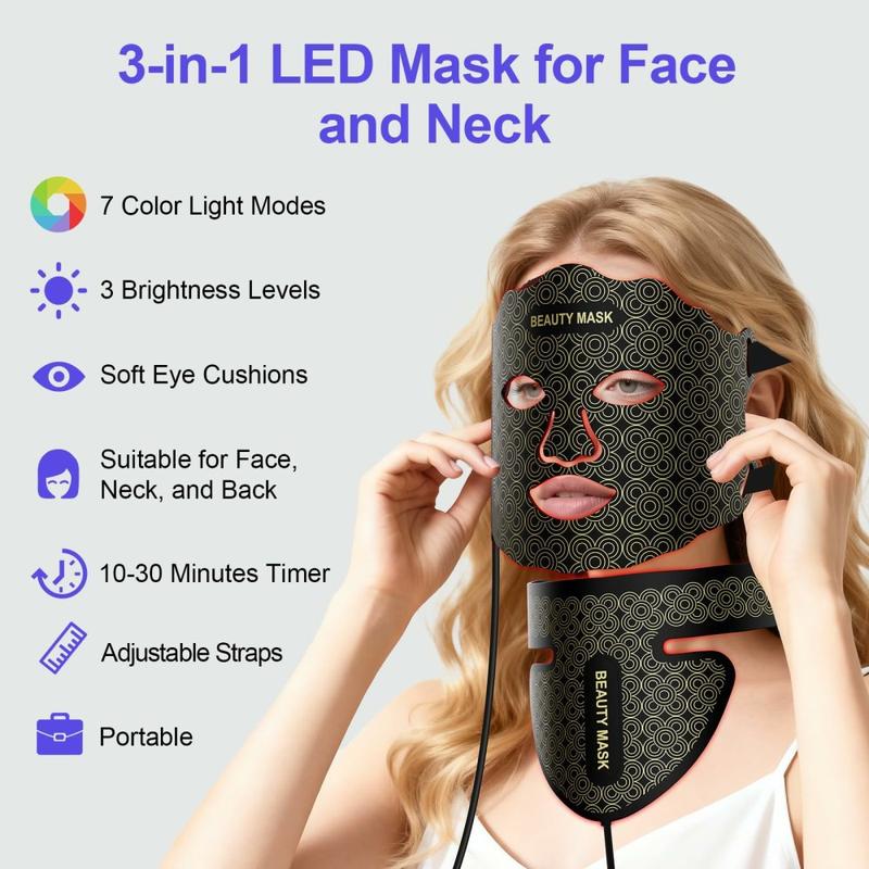 7-farget LED-lysterapi skjønnhetsmaske – ansikts- og nakkehudforyngelsesapparat med 3 intensitetsnivåer