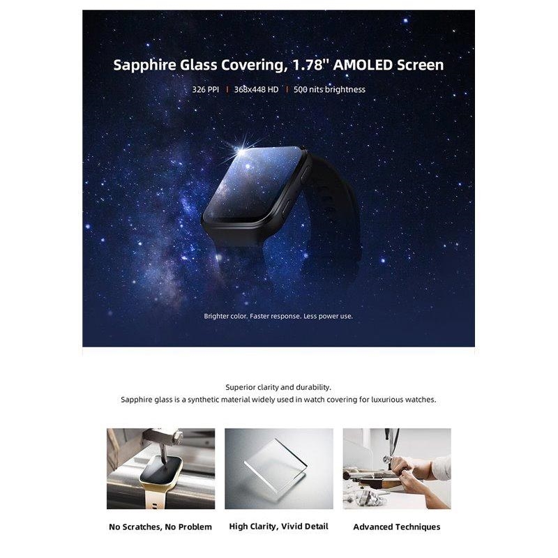 Ripebestandig safirglass, en levende 1.78-tommers AMOLED-skjerm (368 × 448 px, 326 ppi, 500 nits) og et slankt 9,8 mm aluminiumsdeksel gjør 70mai Saphir Watch til en elegant følgesvenn for jobb, treningsøkter og helgeturer. Den veier bare 32,2 g (uten reim), og varer fortsatt i opptil 10 dager på en enkelt 320 mAh-lading.
