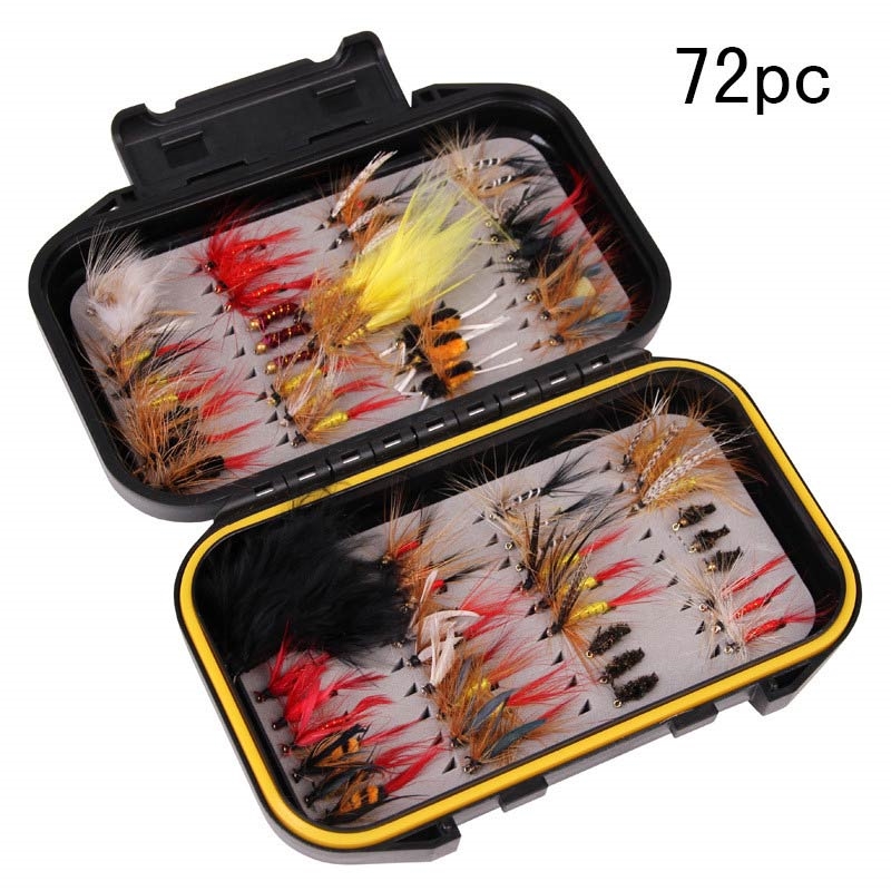Fluefiskesett med 72 deler - håndlagde tørr- og våtfluer, nymfer, streamere med vanntett oppbevaringsboks