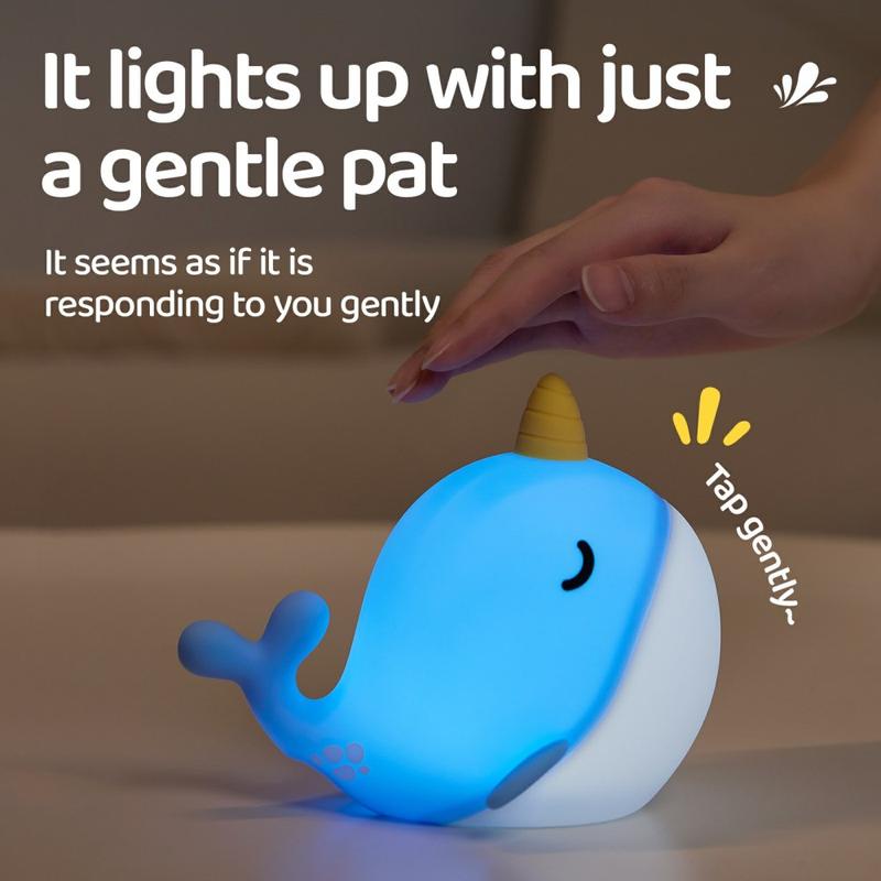 Narhvalen er laget av førsteklasses, hudvennlig silikon og er som skapt for å bli berørt, klemt og holdt. Den myke konsistensen og den varme gløden gjør den til en herlig stressavlastende følgesvenn, ideell for å lindre angst eller hjelpe små barn med å slappe av ved leggetid.