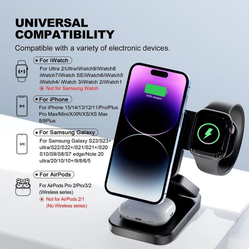 - 3-i-1 trådløs lading - støtter samtidig lading av smarttelefoner, Apple Watch og AirPods, slik at alle enhetene dine er klare til bruk