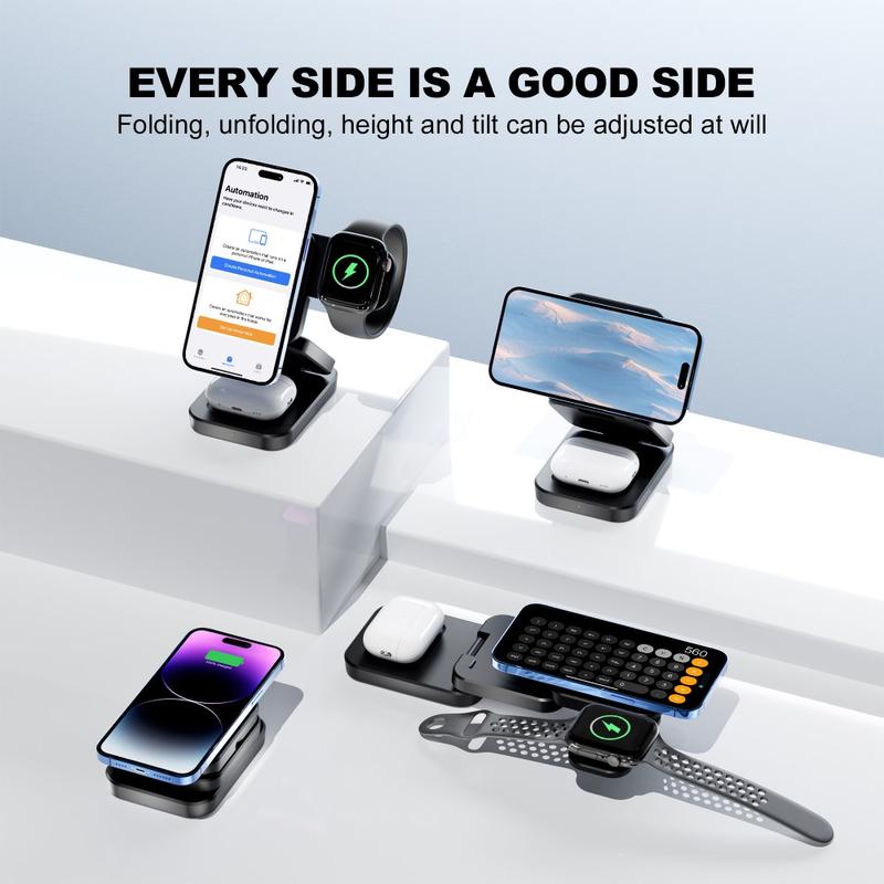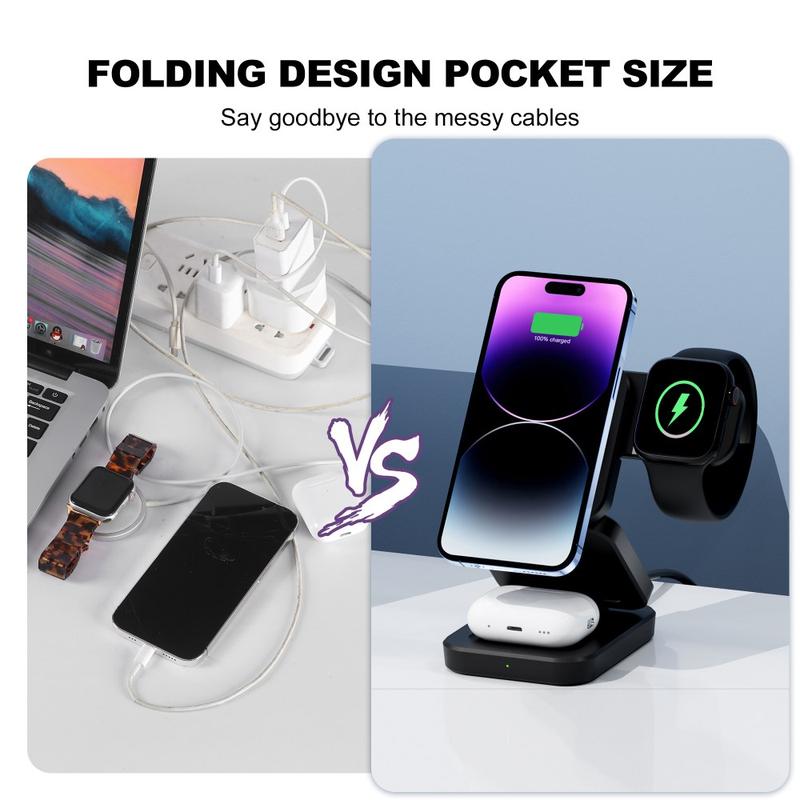 A390 3-i-1 magnetisk trådløs lader - 15W hurtiglading og sammenleggbar brakett