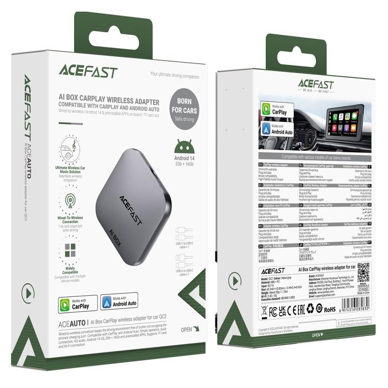 ACEFAST QC2 AI Box oppgraderer umiddelbart bilen din ved å konvertere tradisjonell kablet CarPlay eller Android Auto til et helt trådløst system. Den er designet for en jevnere og morsommere kjøreopplevelse, og støtter både iPhone- og Android-enheter, noe som gir rask tilkobling, sømløs kontroll og fri tilgang til underholdningsapper direkte på bilens skjerm. Med sin kompakte, lette konstruksjon og innebygde, utvidbare lagringsplass gir den komfort og funksjonalitet på neste nivå til alle kompatible kjøretøy.