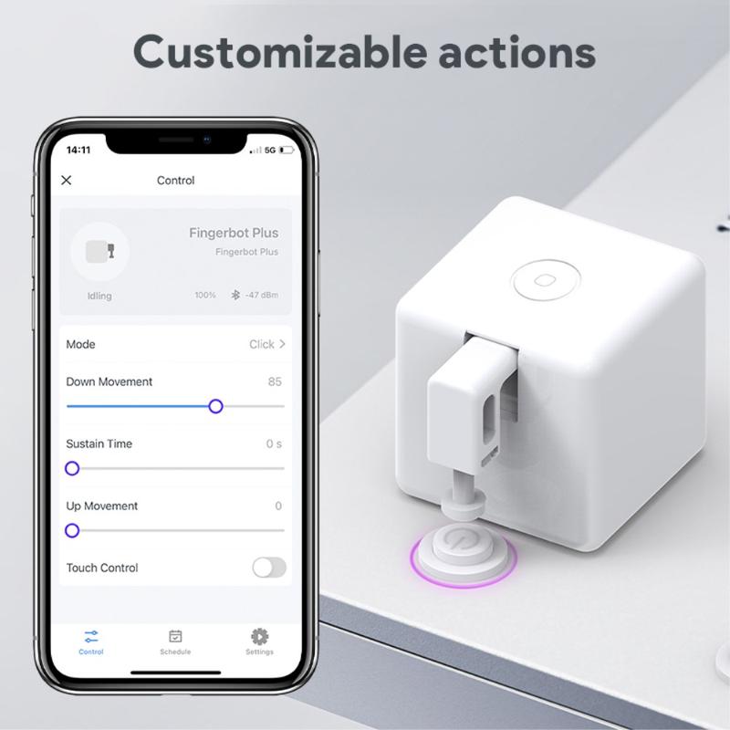 Fingerbot Plus kan automatisere praktisk talt alle enheter med en fysisk knapp - fra kaffemaskiner og klimaanlegg til veggbrytere og skrivebordselektronikk. Med sin presisjonsmotor og tilpassbare trykkavstand kan den tilpasses utallige bruksområder, og bygger bro mellom tradisjonelle apparater og moderne smarthusteknologi.