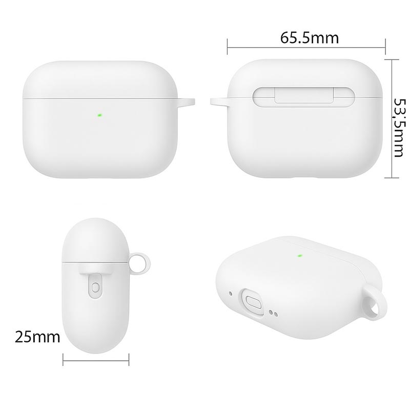- Spesifikasjoner - Materiale: Silikon | Kompatibilitet: AirPods Pro 3 | Tilbehør: Etui + karabinkrok + rengjøringspenn.