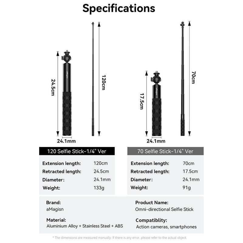 Ta bilder fra alle vinkler med AMAGISN 120cm Selfie Stick for sportskamera, designet for DJI-, GoPro- og Insta360-kameraer. Med 360° vinkelfri justering gir denne selfiepinnen kreativ frihet og perfekte bilder fra alle perspektiver. Den er laget av aluminium i flykvalitet og er både slitesterk og lett, noe som gjør den ideell for bruk på farten. Den to-trinns låsemekanismen sørger for stabilitet, mens skruen i rustfritt stål gir et sikkert feste. Kompatibel med stativer takket være 1/4"-gjengetilkoblingen.