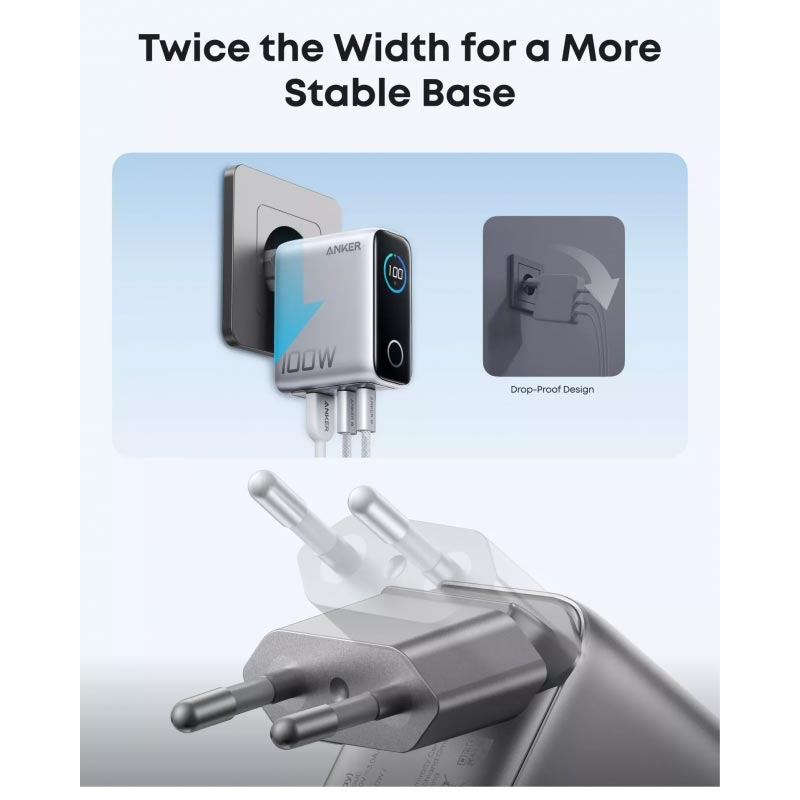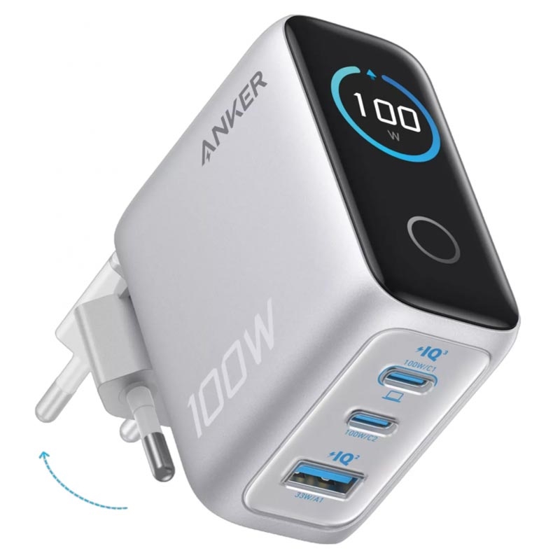 Anker 100W GaN-vegglader med smart display og USB-C-kabel - hurtiglader med 2 USB-C- og 1 USB-A-port