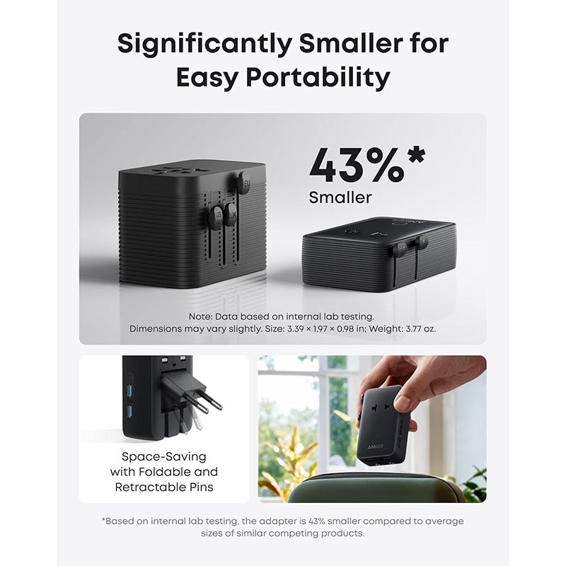 Anker Nano Travel Adapter er den ideelle kompakte strømløsningen for reisende over hele verden. Den er designet for å fungere i over 200 land, og har fire universelle pluggtyper - type A, type I, type G og type C - som sikrer sømløs kompatibilitet uansett hvor du drar. Med totalt fem porter, inkludert to USB-C- og to USB-A-utganger samt et universelt AC-uttak, kan du lade flere enheter samtidig, selv når du er på farten.