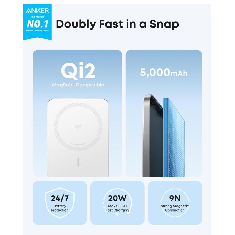 Anker Nano Slim magnetisk powerbank 5000mAh med Qi2 hurtiglading og USB-C-port, ultratynn design