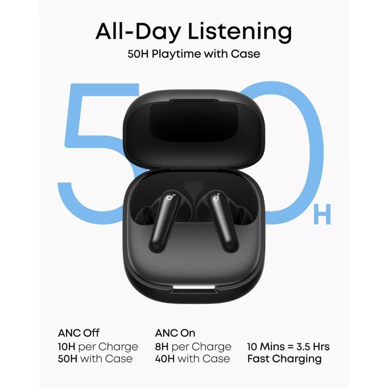 Med opptil 10 timers avspilling på én lading og opptil 50 timer totalt med ladeboksen, er Soundcore R60i NC laget for langvarig daglig bruk. Støtte for hurtiglading gir ekstra bekvemmelighet, og gir deg opptil 3 timers lytting etter bare 10 minutters lading. IP55-vann- og støvmotstand på øreproppene gjør dem også til et pålitelig valg for trening, utendørs bruk og daglig bruk.