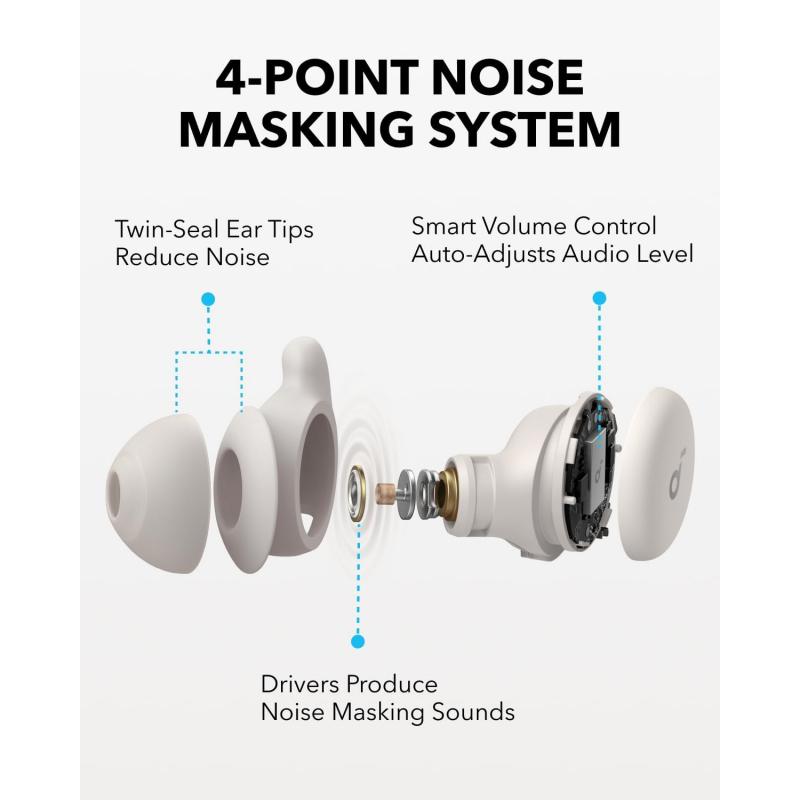 Soundcore Sleep A20-øreproppene er designet for å gi en fredelig søvnopplevelse med avanserte støyblokkerings- og komfortfunksjoner. De er utstyrt med et 4-punkts støymaskeringssystem og er perfekte for deg som trenger et stille, distraksjonsfritt miljø for avslappende netter.
