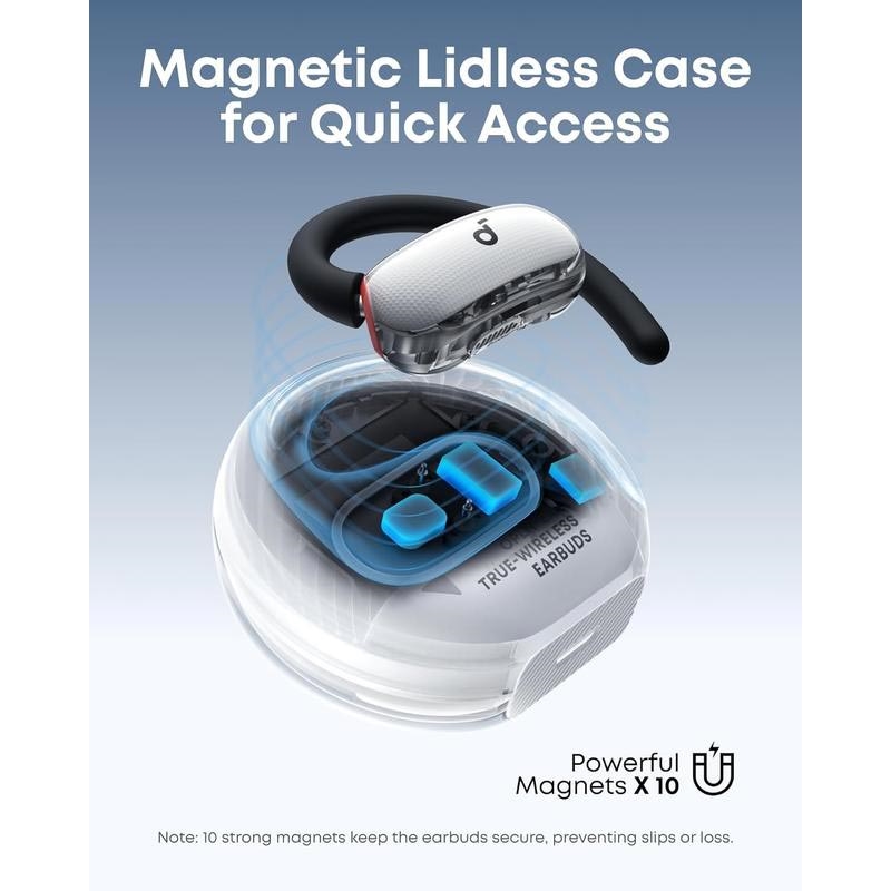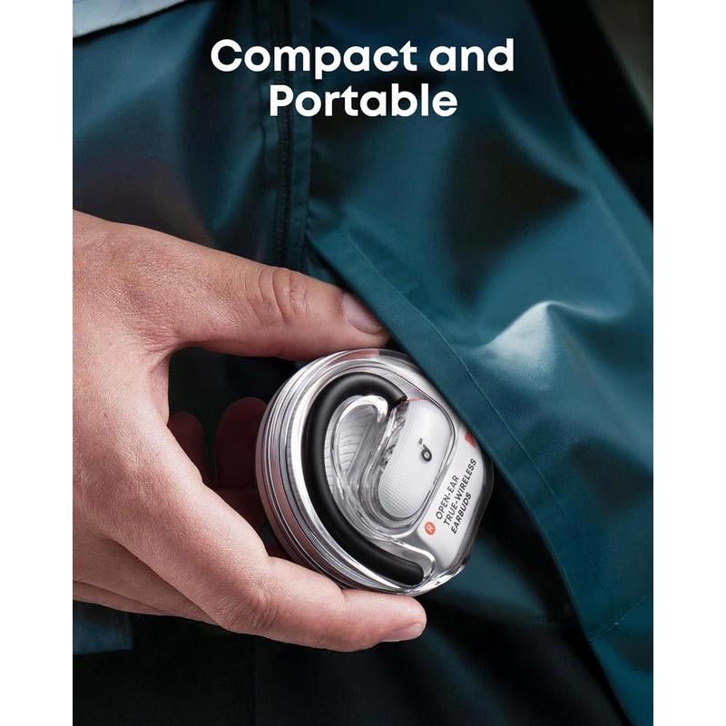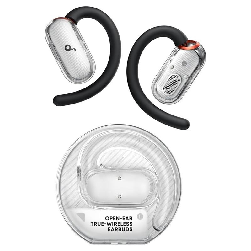 Soundcore V40i åpne hodetelefoner er designet for en aktiv livsstil der komfort, bevissthet og lydkvalitet er viktig. Med en innovativ open-ear-design og justerbare ørekroker sitter de komfortabelt utenfor øregangen, slik at du kan nyte musikk samtidig som du er oppmerksom på omgivelsene dine. Det elegante, gjennomsiktige ladeetuiet uten lokk gir en moderne touch og gir rask og enkel tilgang uansett hvor du er.