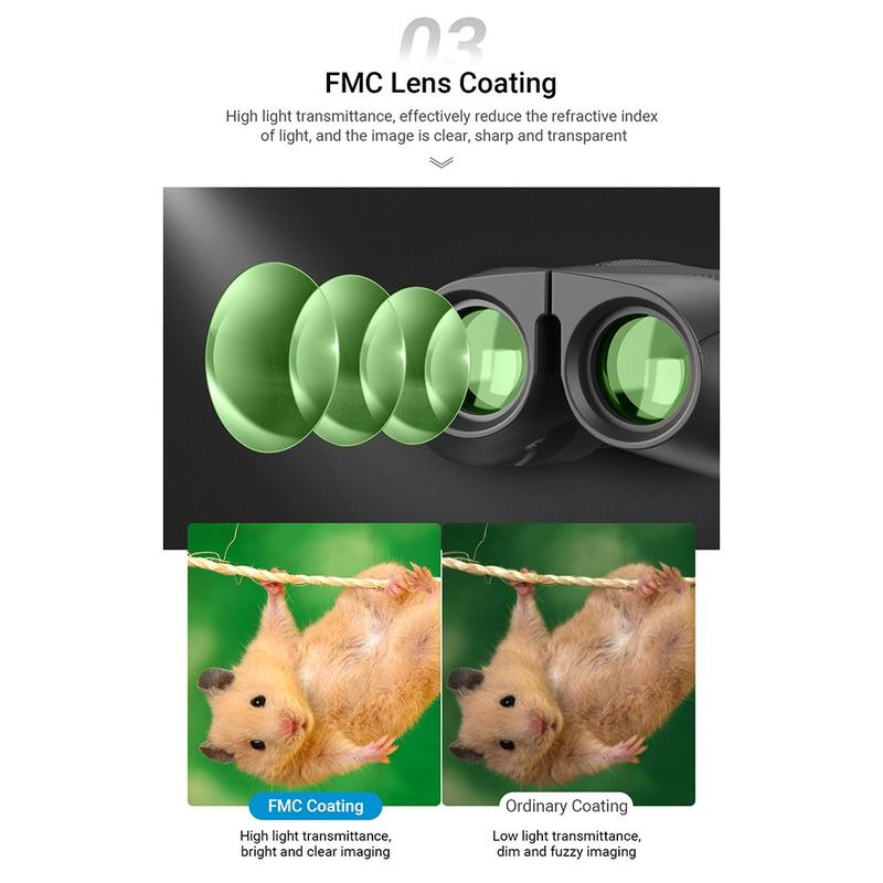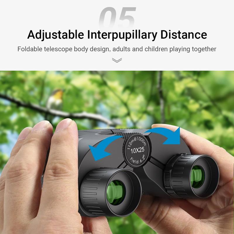 Den justerbare sammenleggbare designen gjør det enkelt å tilpasse kikkerten til ulike interpupillære avstander, noe som gjør den egnet for både voksne og barn.