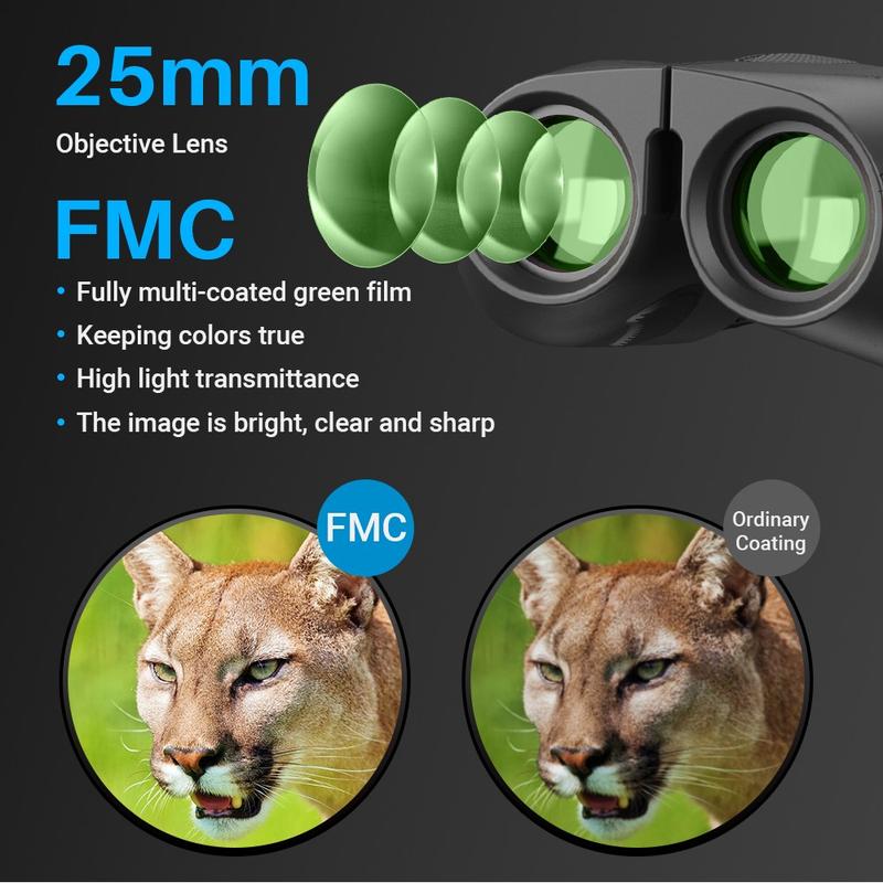 Kikkerten er utstyrt med BAK4-prisme og FMC-linser (Fully Multi-Coated), noe som gir lyse, skarpe og kontrastrike bilder med utmerket fargegjengivelse. Okularet på 16 mm og objektivlinsen på 25 mm gir et bredt synsfelt på 112 m/1000 m (6,2°), noe som gir en komfortabel og stabil synsopplevelse med minimal forvrengning og ingen svimmelhet.