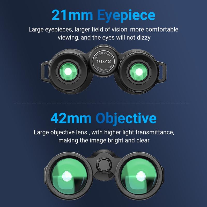 Et stort okular på 21 mm og 14 mm øyeavlastning gir komfortabel visning, mens utgangspupillen på 4,2 mm sikrer stabil ytelse under forhold med lite lys, for eksempel ved daggry, i skumring eller i skyggefulle skoger. APEXEL 10×42-kikkerten er kompakt, men likevel kraftig, og er laget for brukere som krever klarhet og pålitelighet utendørs.