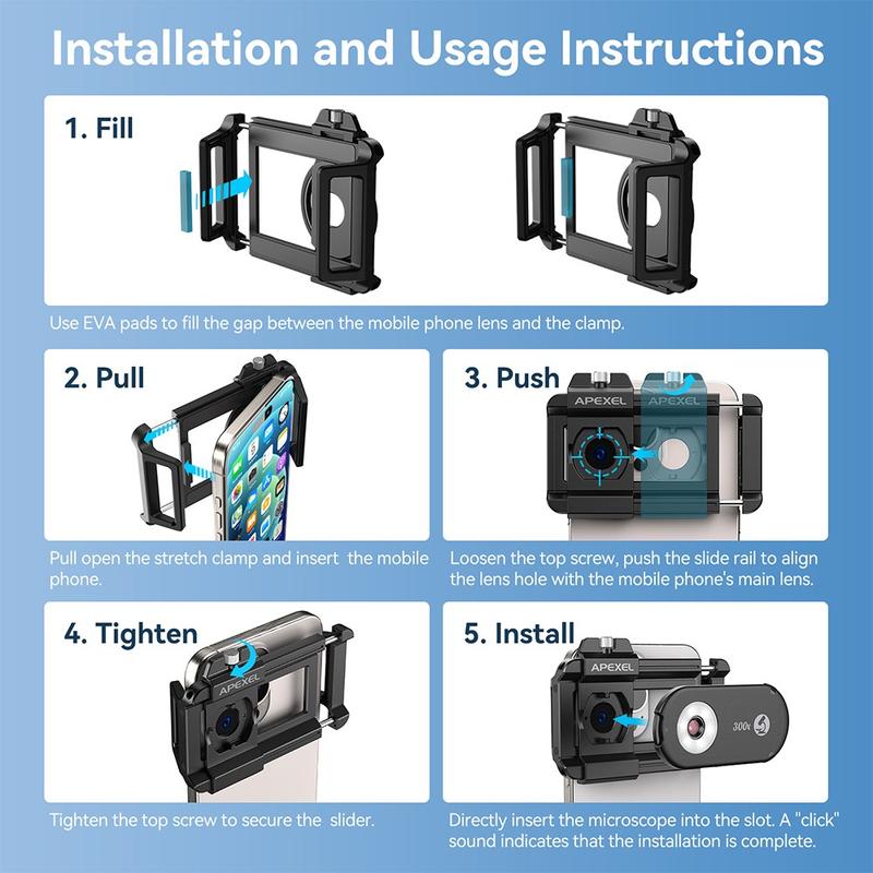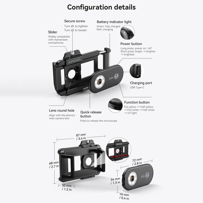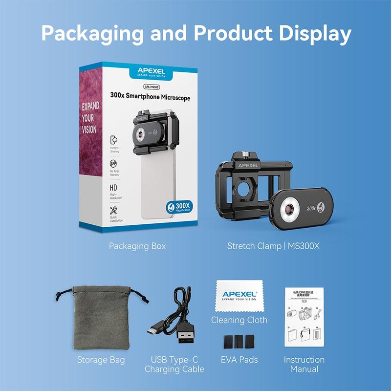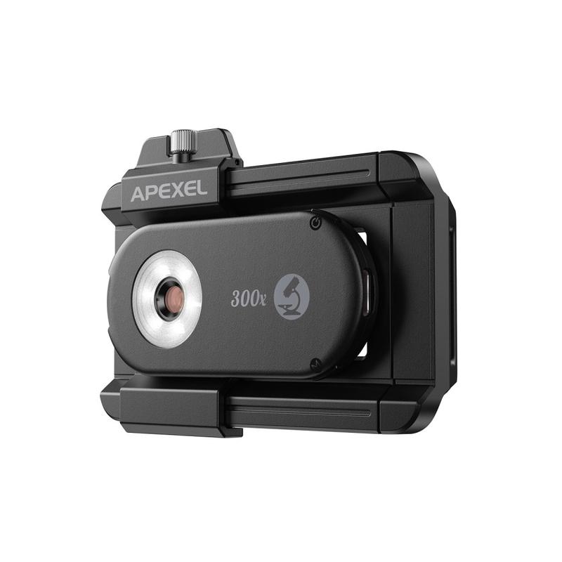 APEXEL APL-MS300 mikroskoplinse leverer forstørrelse og belysning på profesjonelt nivå i et verktøy i lommeformat. Den presise optikken, trefargede LED-belysningen og UV-deteksjonen gjør det til et uunnværlig tilbehør for utforskning, forskning og kreativ fotografering.