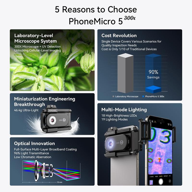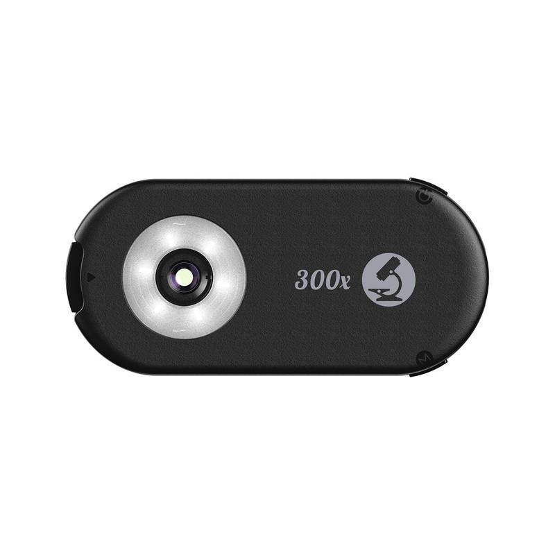 Apexel APL-MS300 300X mikroskoplinse for smarttelefon - Clip-On forstørrelsesglass med trefarget LED-belysning og UV-deteksjon