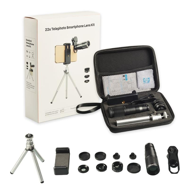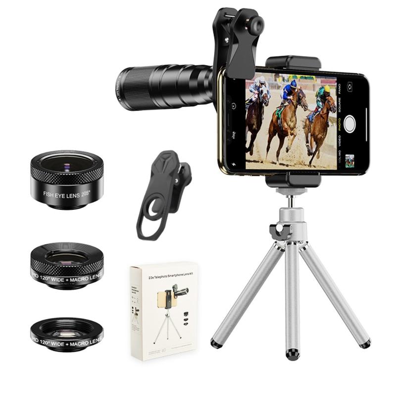 APEXEL objektivsett for telefonkamera, 22X teleobjektiv + 120° vidvinkelobjektiv + 25X makroobjektiv + 205° fiskeøyeobjektiv
