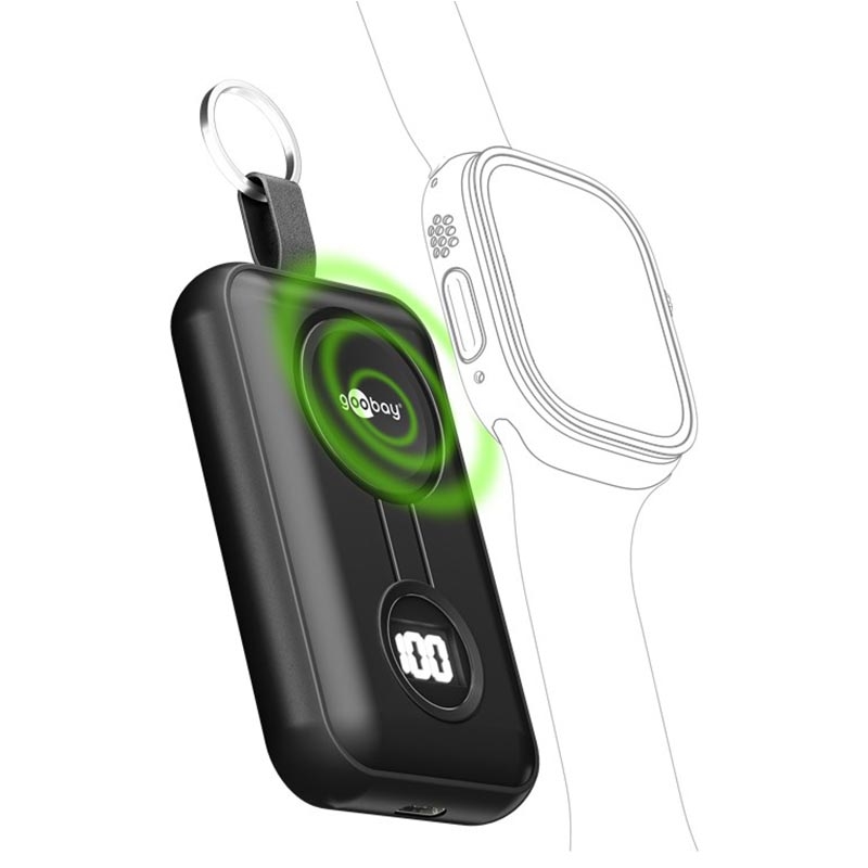Goobay trådløs powerbank for Apple Watch 2500mAh - magnetisk klokkelader med USB-C, LED-display, nøkkelring, 2,5W trådløs / 5W kablet