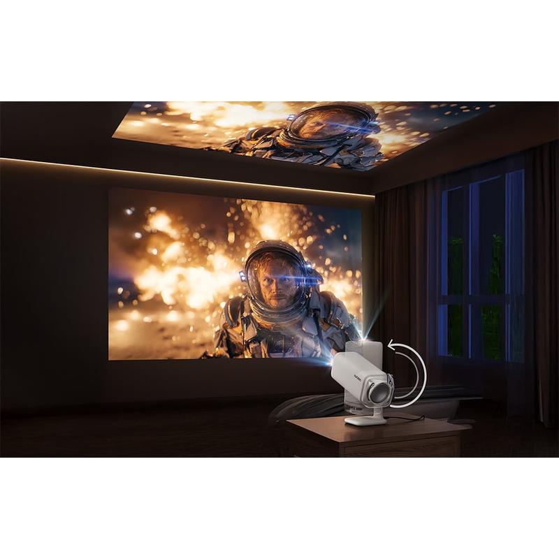 Oppsettet er designet for å være raskt og håndfritt. Real-Time Focus bruker ToF-avstandsmåling for å holde bildet skarpt, mens elektrisk keystone-korreksjon justerer geometrien automatisk når projektoren er vinklet. Auto Screen Alignment tilpasser bildet til projeksjonsflaten, og Auto Obstacle Avoidance hjelper med å holde bildet rent når noe er i veien. Den justerbare basen (opptil 110 grader) gjør det enkelt å projisere på en vegg eller tak, og den kompakte designen samt USB-C-strømstøtte betyr at du kan ta den med utendørs med en passende PD-lader eller powerbank.