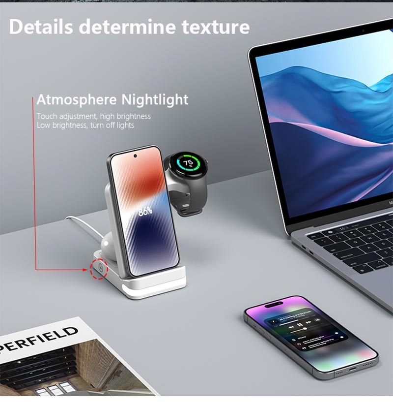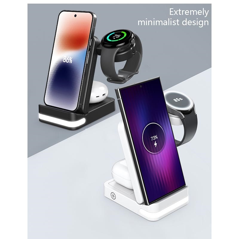 Effektiviser ladeoppsettet ditt med den trådløse 3-i-1-laderen B-27. Lad telefonen, Samsung Galaxy Watch (serie 3/4/5/6/7) og ørepropper på én gang, samtidig som du kan nyte stemningen av et mykt nattlys som gir et beroligende miljø uten rot.