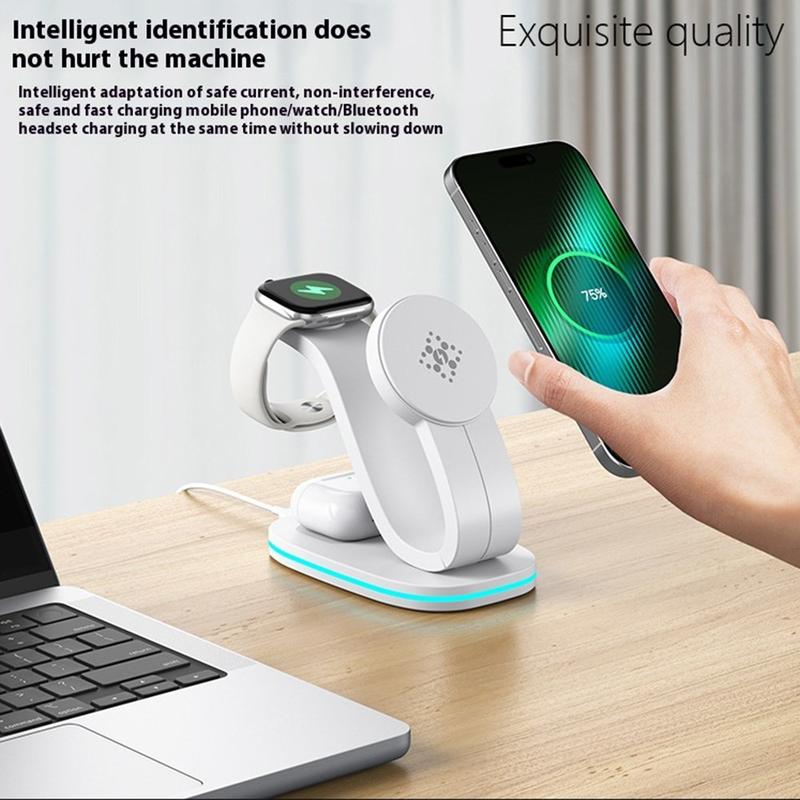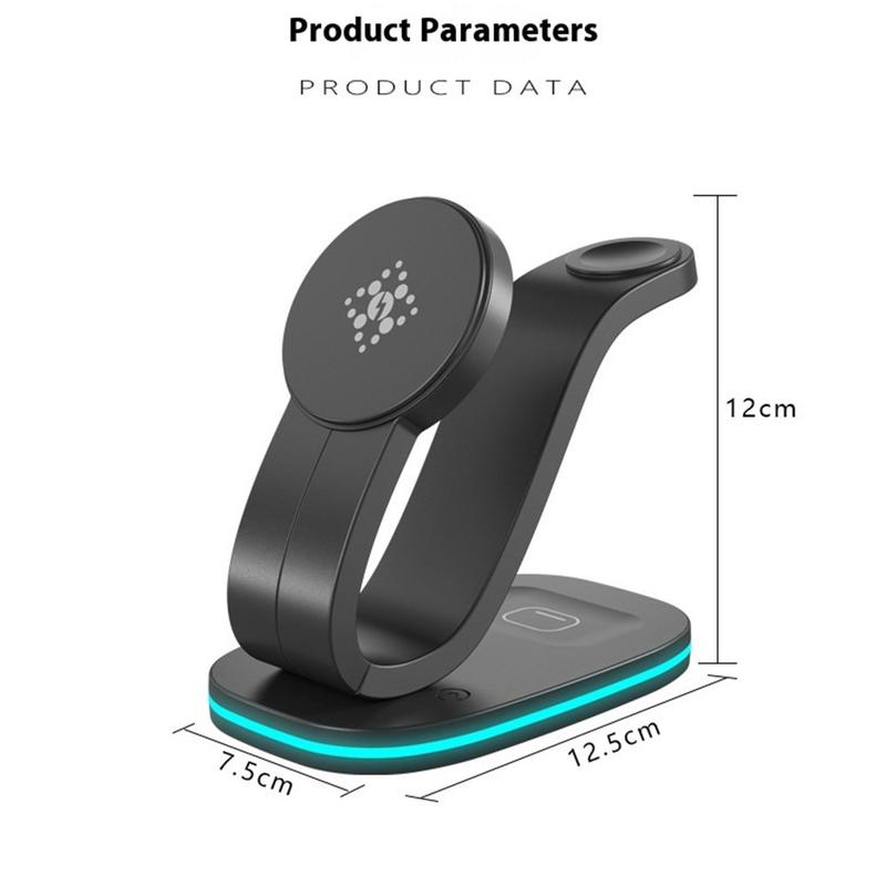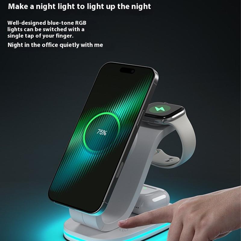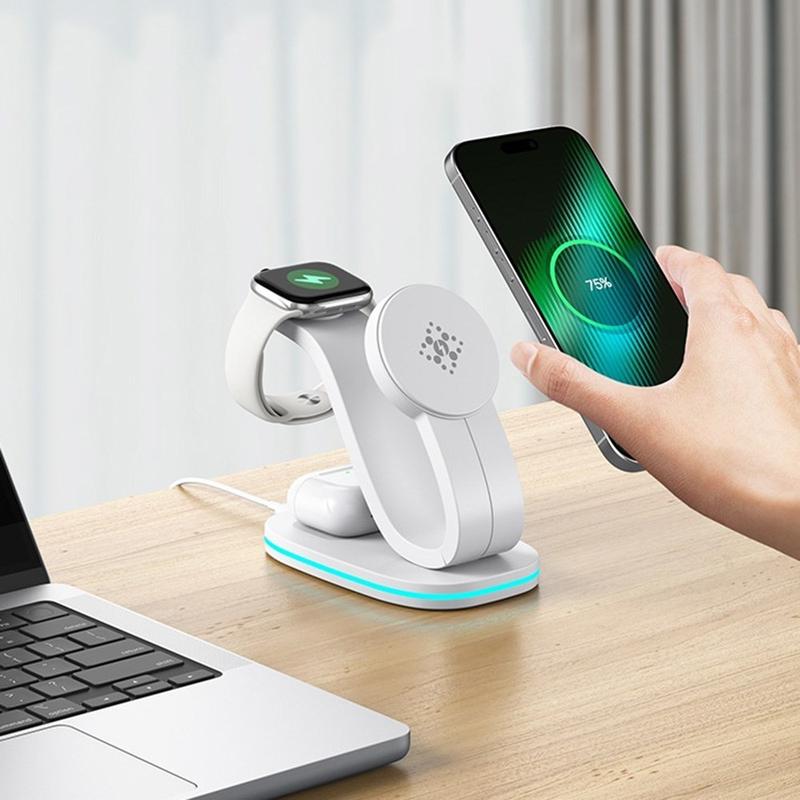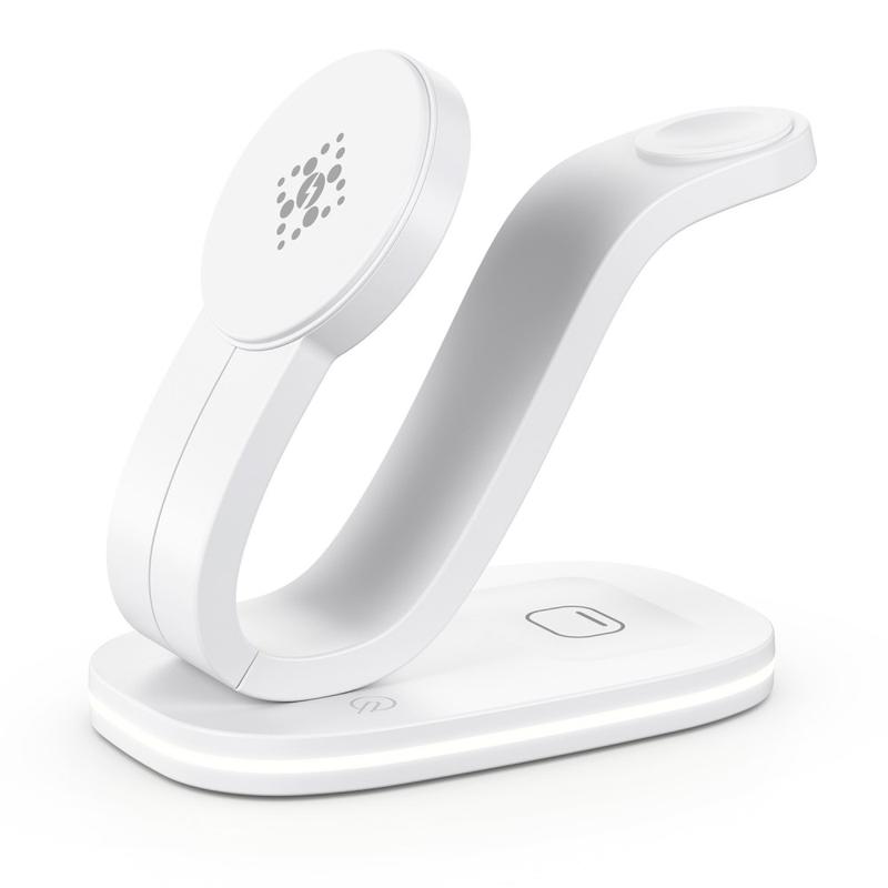 Få mindre rot på skrivebordet med ett enkelt stativ som leverer rask trådløs lading på 15 W, lader smartklokken din med 2 W, mater øreproppene dine med 3 W og fungerer som et skånsomt nattlys.