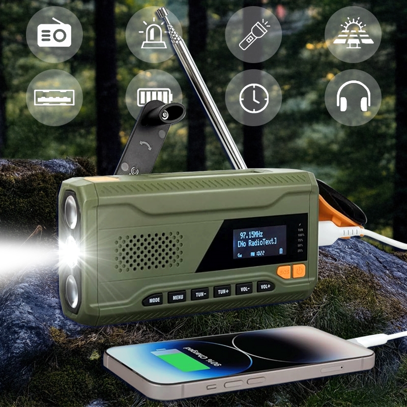 Den multifunksjonelle nødradioen er designet for å holde deg tilkoblet og trygg under utendørs reiser eller i nødssituasjoner. Med 3 moduser for DAB/FM/trådløs(BT) avspilling kan den lagre 30 forhåndsinnstilte DAB-stasjoner og 30 FM-forhåndsinnstilte stasjoner, og en stor LCD-skjerm som viser radiostasjonsnavn, stasjonsinformasjon og tid. Radioen har en 40 mm/2w fullfrekvens intern magnetisk høyttaler for bedre lydytelse og 3 stk * 1W COB LED-enhet med høy lysstyrke med 3 typer lysmodus for ulike lysforhold. I nødstilfeller er den utstyrt med et SOS-lommelyktfyr som blinker morsekode og en høy alarmlyd for raskt å finne posisjonen din. I tillegg har radioen en 400mA håndsveivgenerator, et solcellepanel for batterilading, og et innebygd 4500mAh Li-ion oppladbart batteri som gir mulighet for 25 timer med lys eller 50 timer med radio på en enkelt lading. Radioen har også en Type-C ladeinngangsport, en USB-utgangsport for lading av bærbare enheter, og en teleskopisk antenne for bedre mottaksytelse.