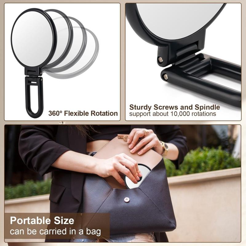 Se hver eneste detalj når det gjelder. Dette kompakte, sammenleggbare speilet har en standard speilside med sann visning og en side med 10 ganger forstørrelse for presisjonsoppgaver. Det 360-graders roterbare håndtaket kan låses på plass slik at du kan bruke det håndholdt, henge det på en krok eller stille det på et bord. Den er lett og reisevennlig, og kan enkelt tas med i vesken for hudpleie, sminkeoppussing eller rask inspeksjon av munnen når du er på farten.
